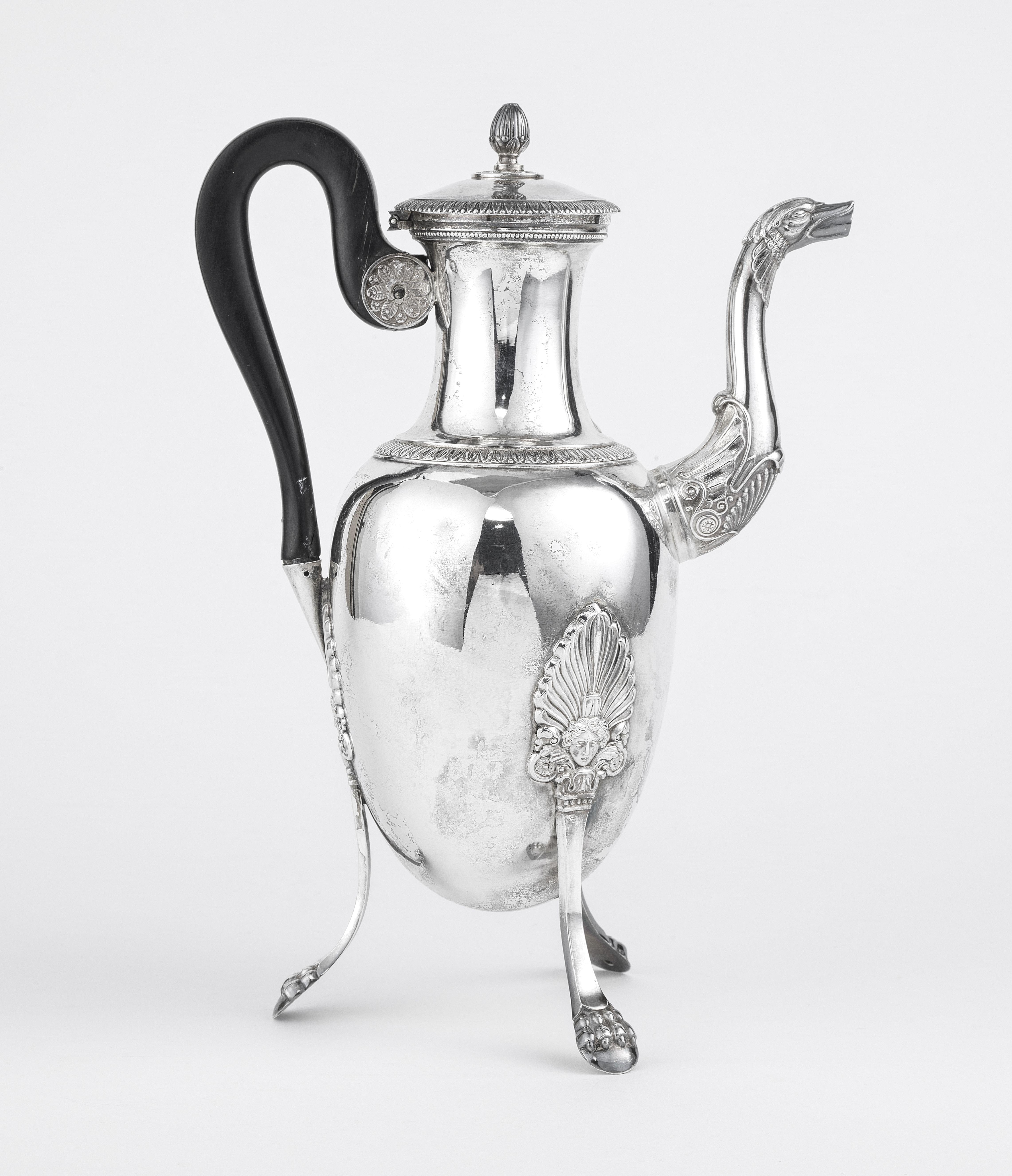 3768. Cafetière tripode d'époque Restauration à bec verseur tête de cygne