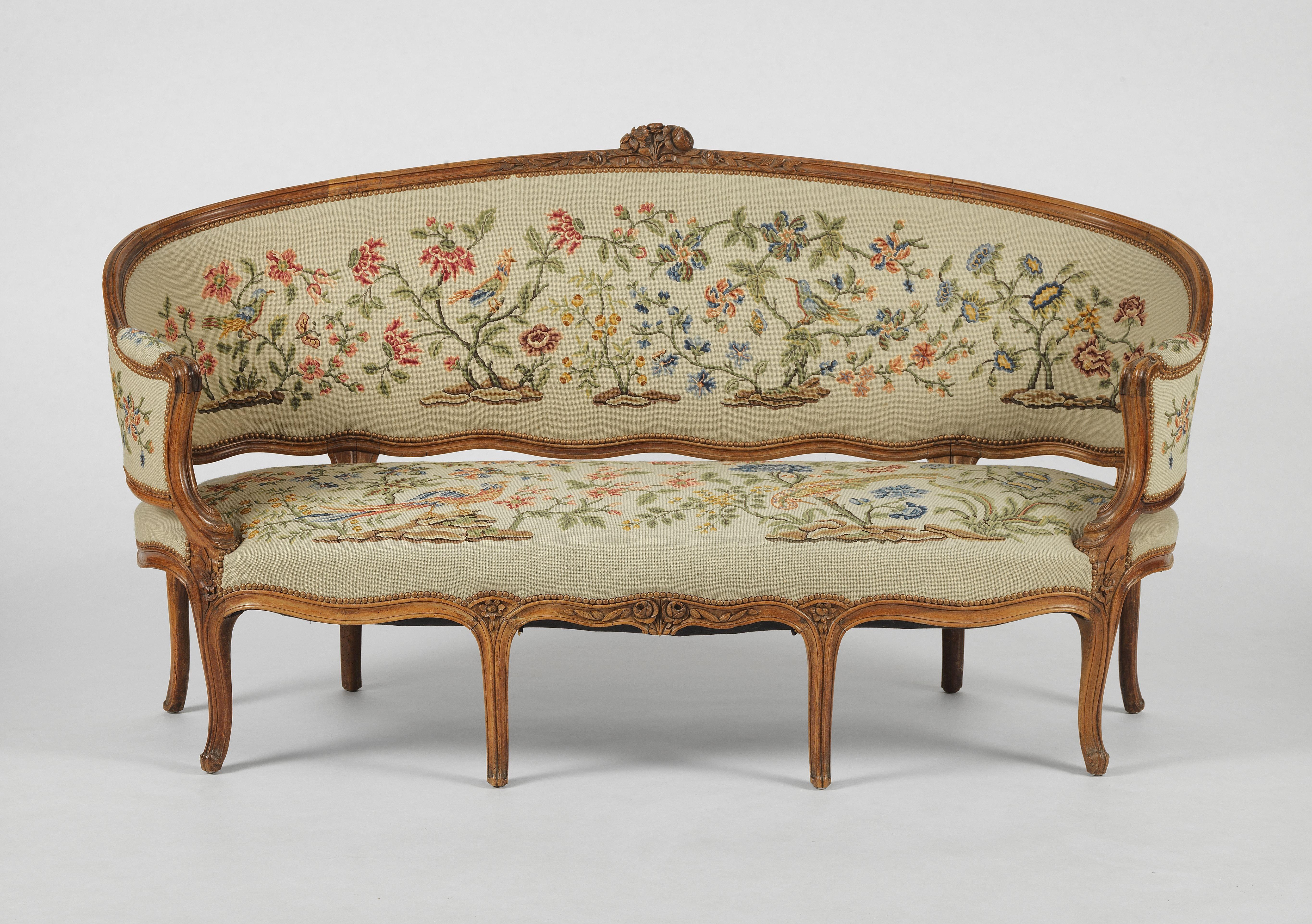 Bois au naturel, garniture au petit point sur fond beige, L 195 cm