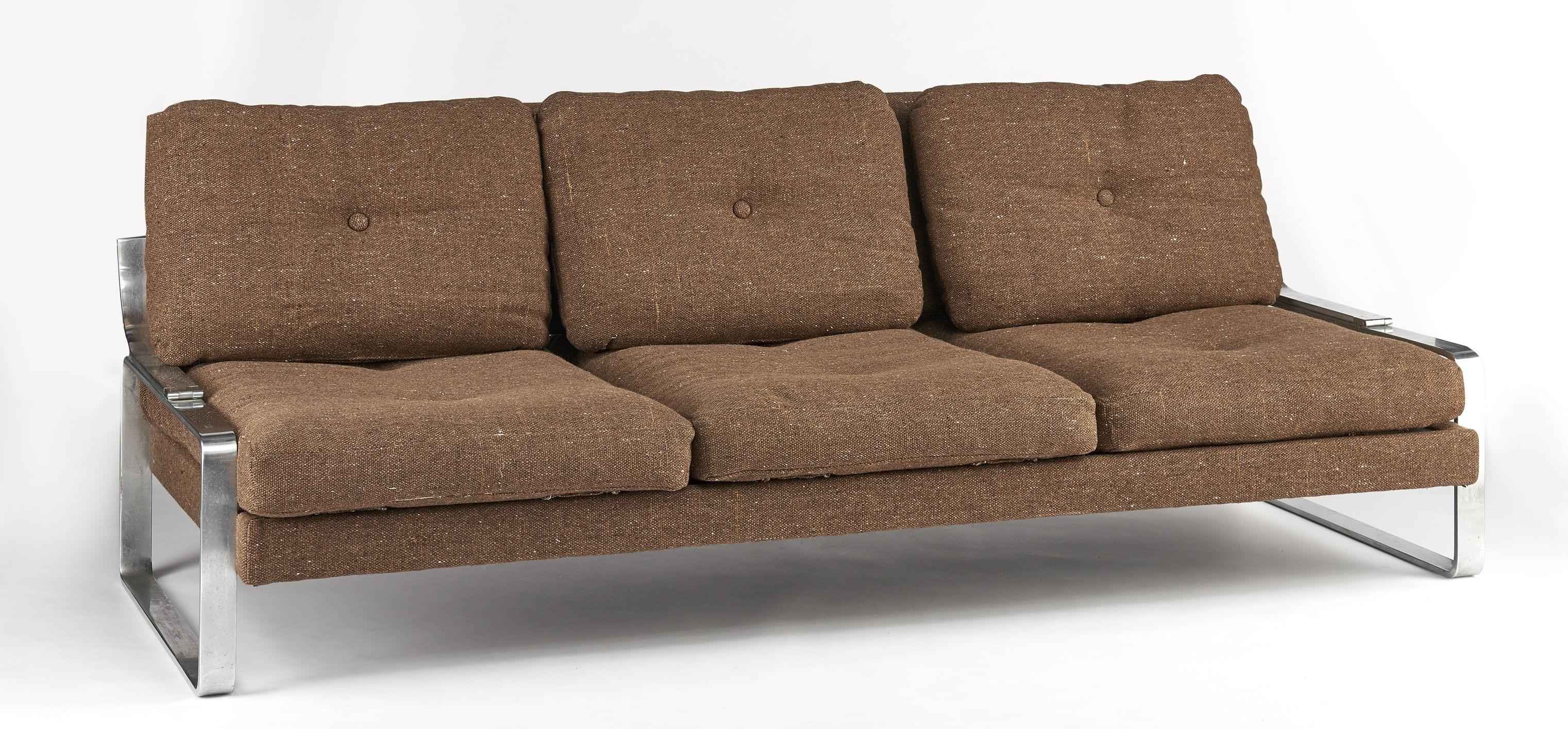 Acier chromé, garniture de drap de laine chocolat, dossier amovible pour former un lit d'appoint, L 207 cm