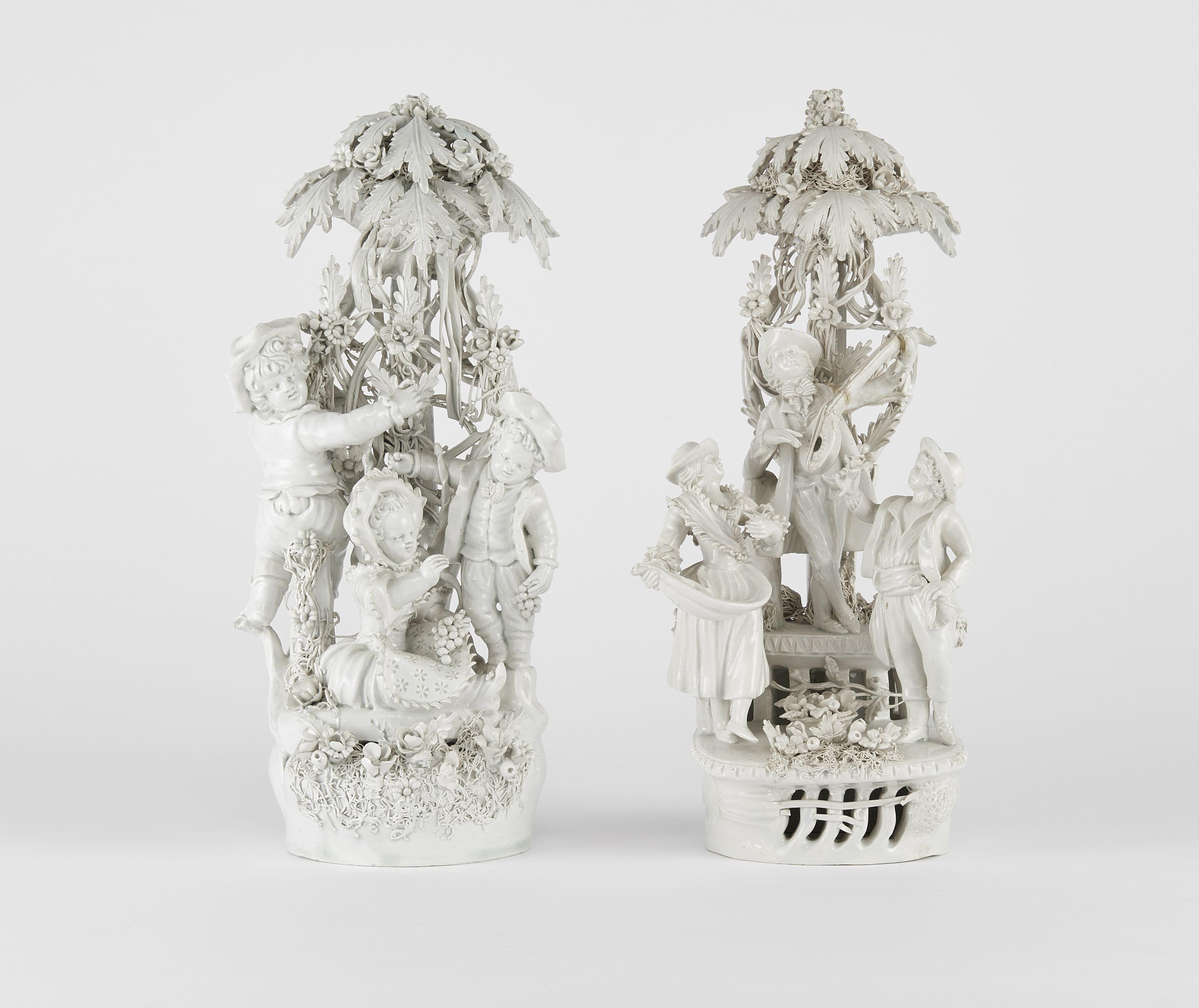 Deux groupes, musiciens et enfants, porcelaine blanche, H 32 cm