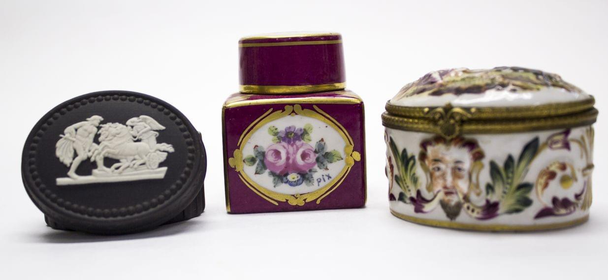 Encrier et deux boîtes, porcelaine, H 4 à 6 cm
