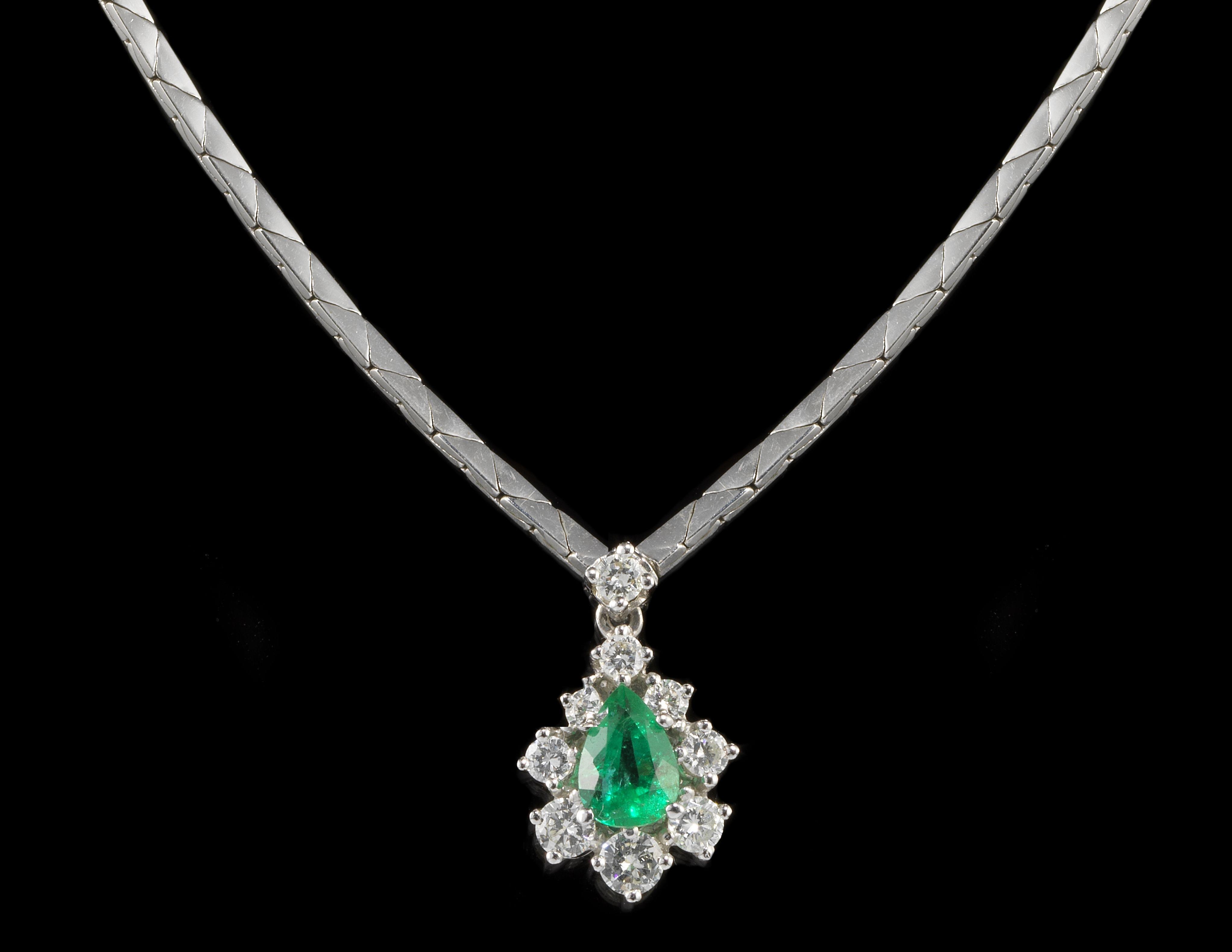 3486. Carl Bücherer, collier retenant une émeraude taille poire (0,56 ct) entourée de diamants (total 0,6 ct)