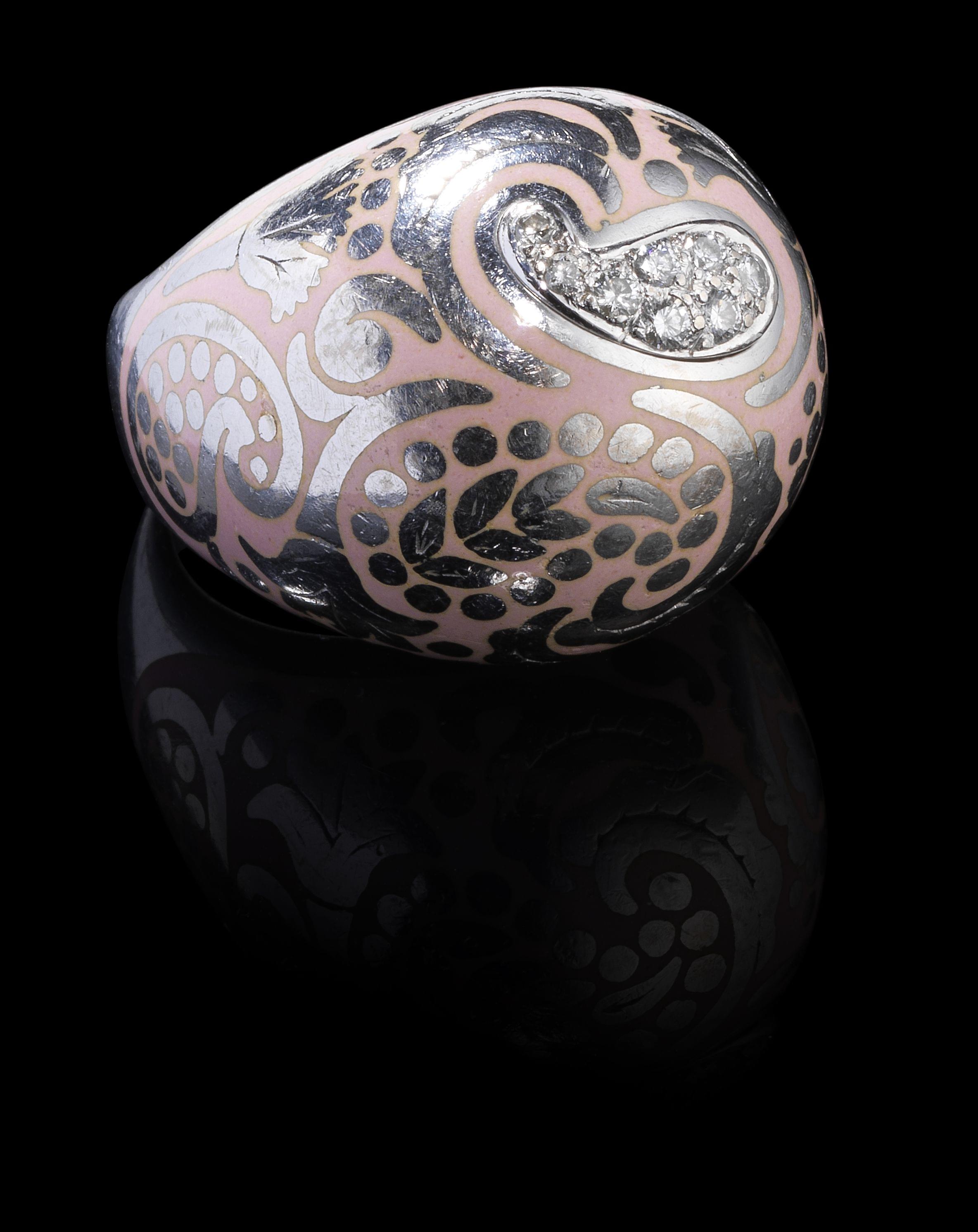 215. Carrera Y Carrera, bague dôme émaillée rose à motif paisley centrée d'un motif pavé de diamants