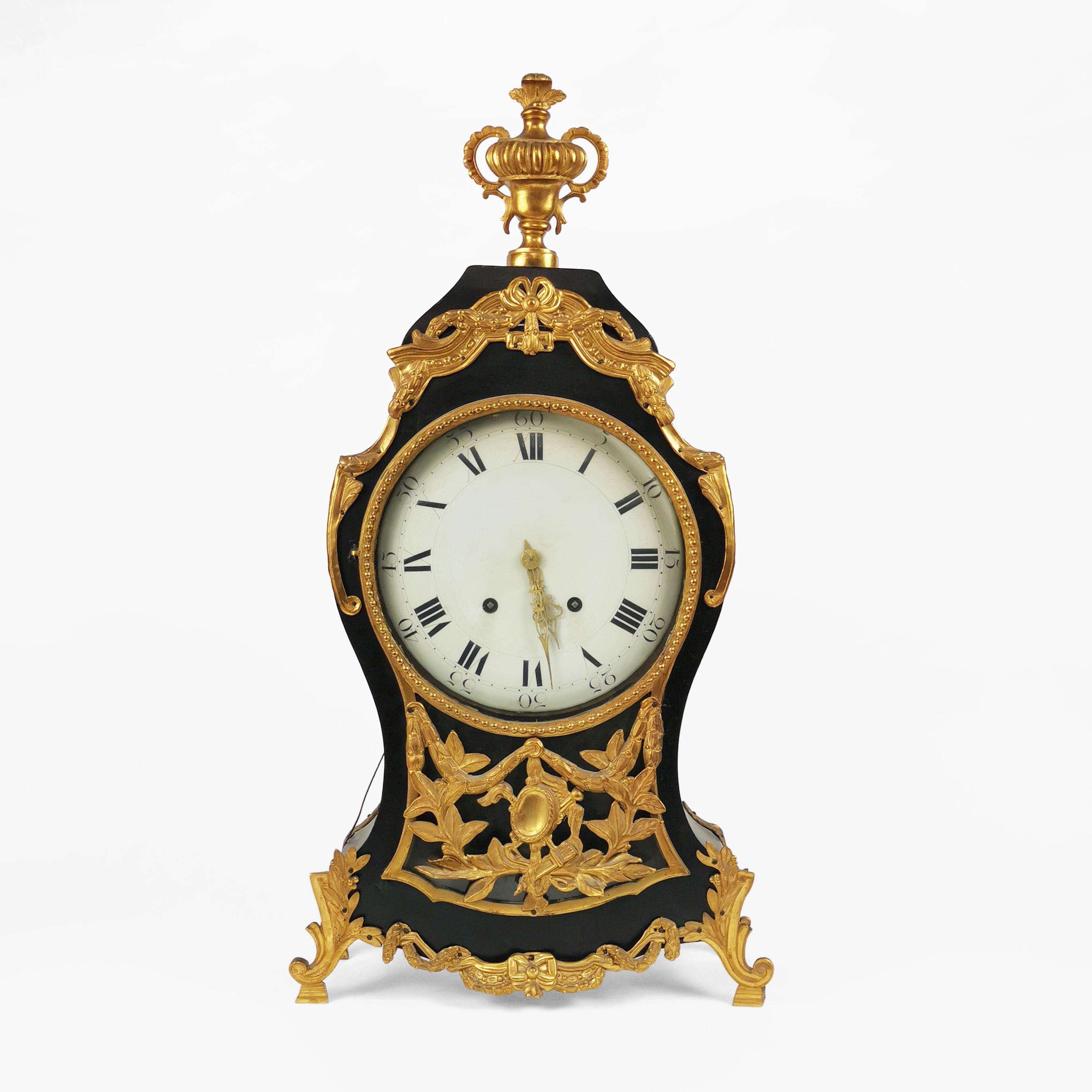 Bois laqué noir, émail blanc, tôle et bronze doré à décor de rubans et surmonté d'un vase à anses, H 80 cm
