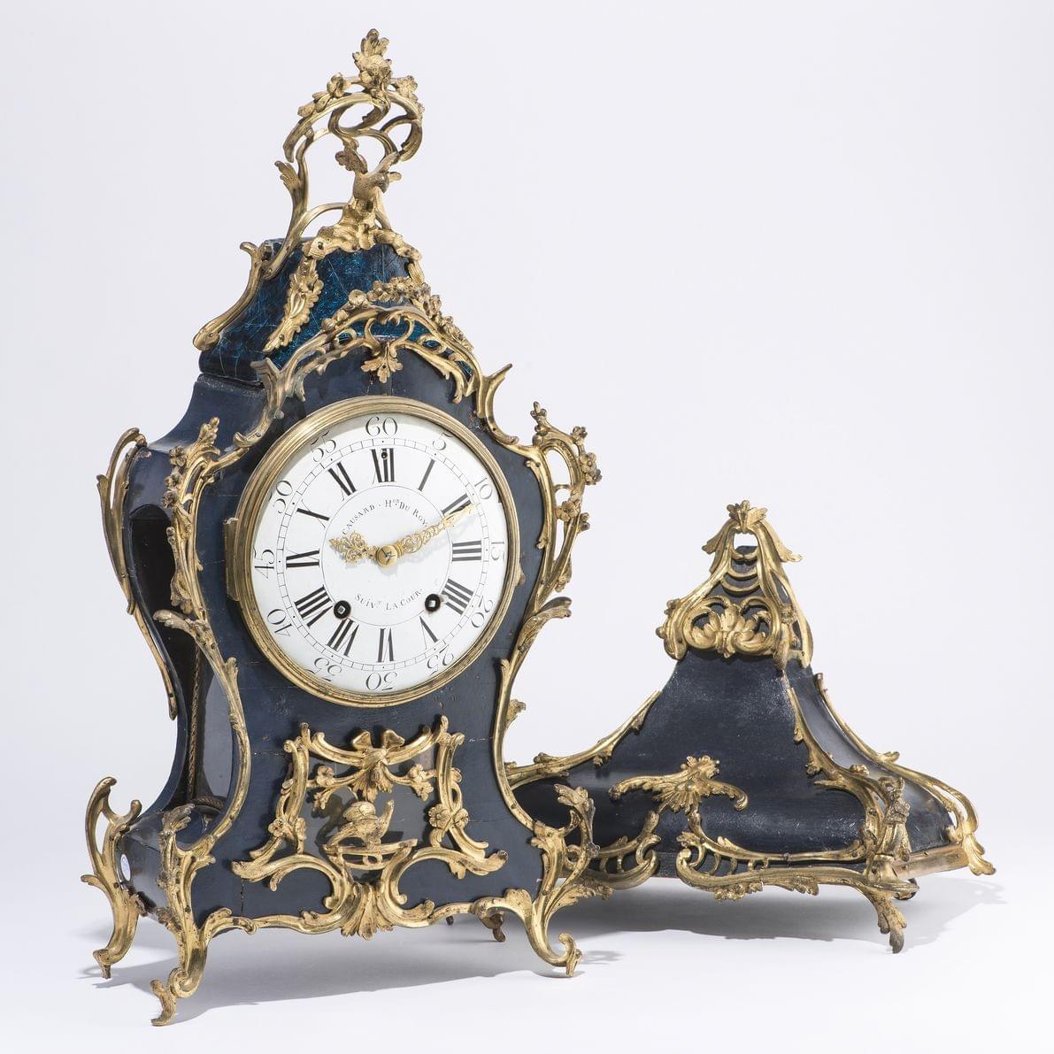 Bois vernis bleu nuit et bronze doré, cadran émaillé blanc signé Causard, 103x41x21,5 cm