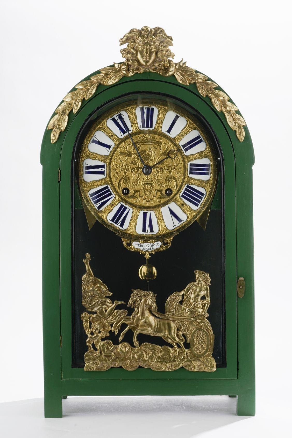 Cadran en laiton et émail à chiffres romains, signé Pierre Goret à Paris, caisse en bois laqué vert à décor du char d'Apollon et d'une tête de Mercure, H 68 cm