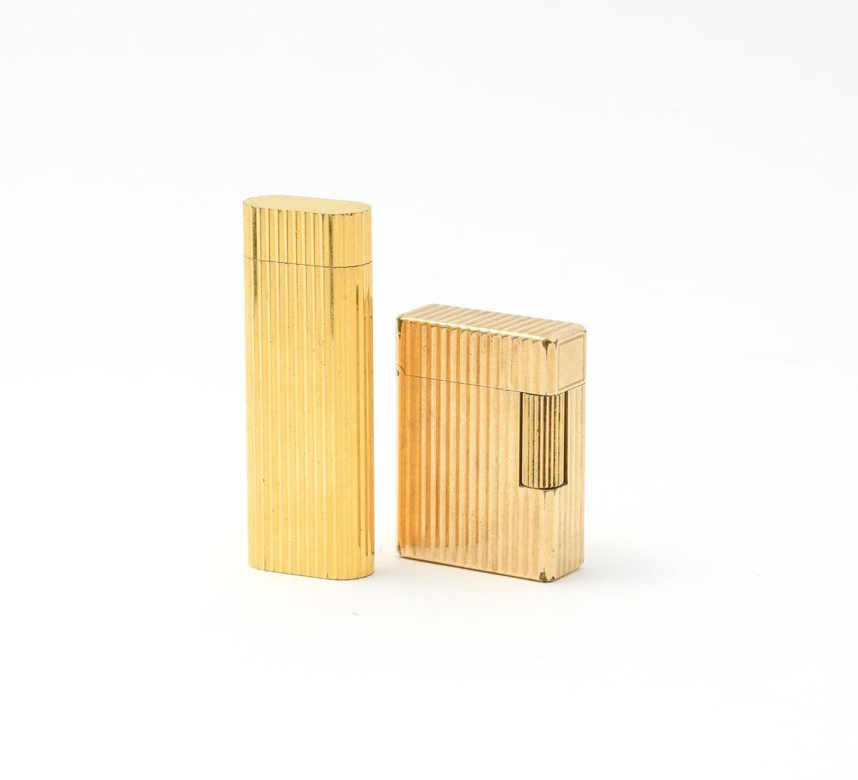 Plaqué or, H 7 cm. On joint un briquet Dupont Paris en métal doré, H 47 mm.