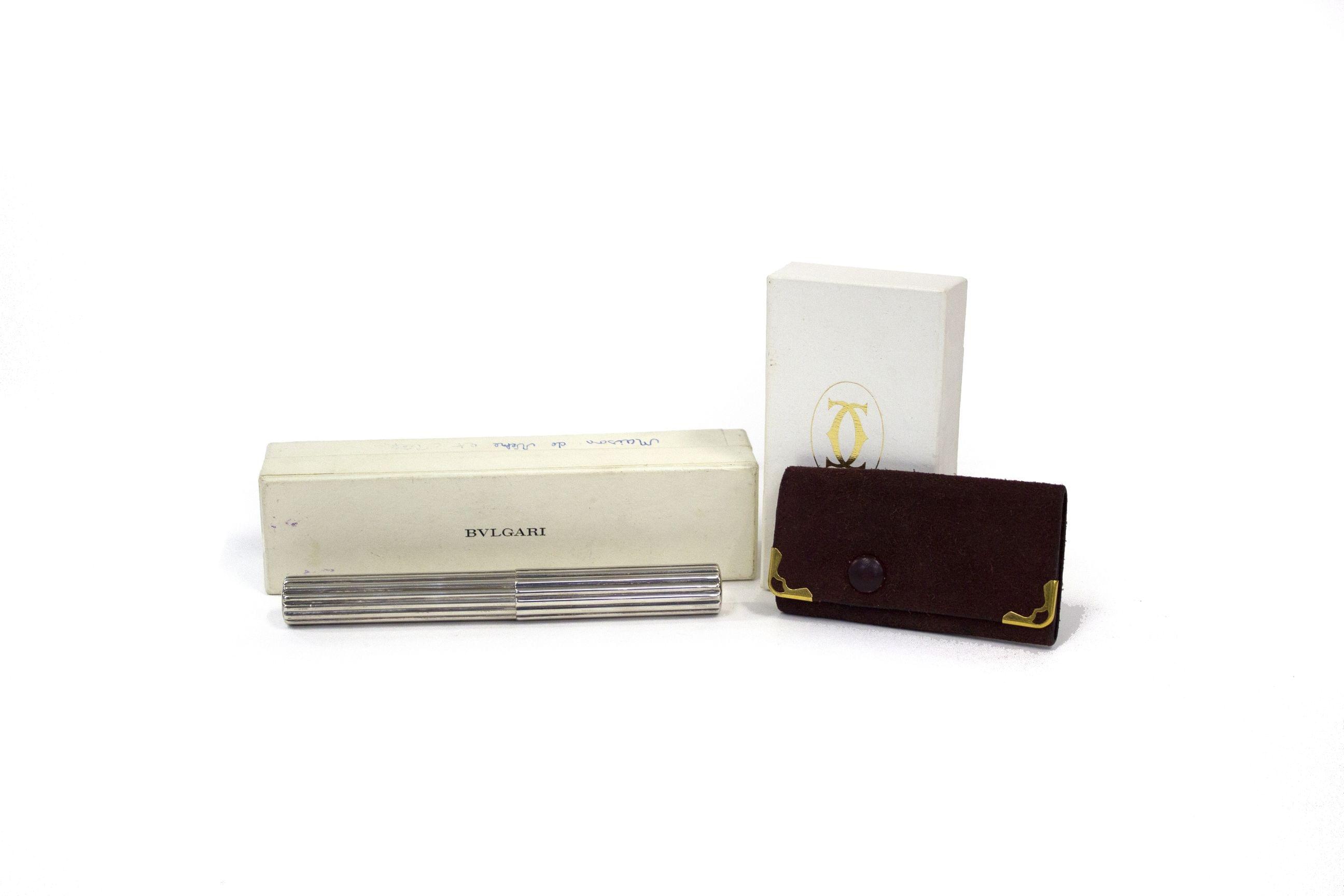 Cuir bordeaux, garniture en métal doré, dans sa boîte, H 9 cm. On joint un stylo Bulgari en argent.