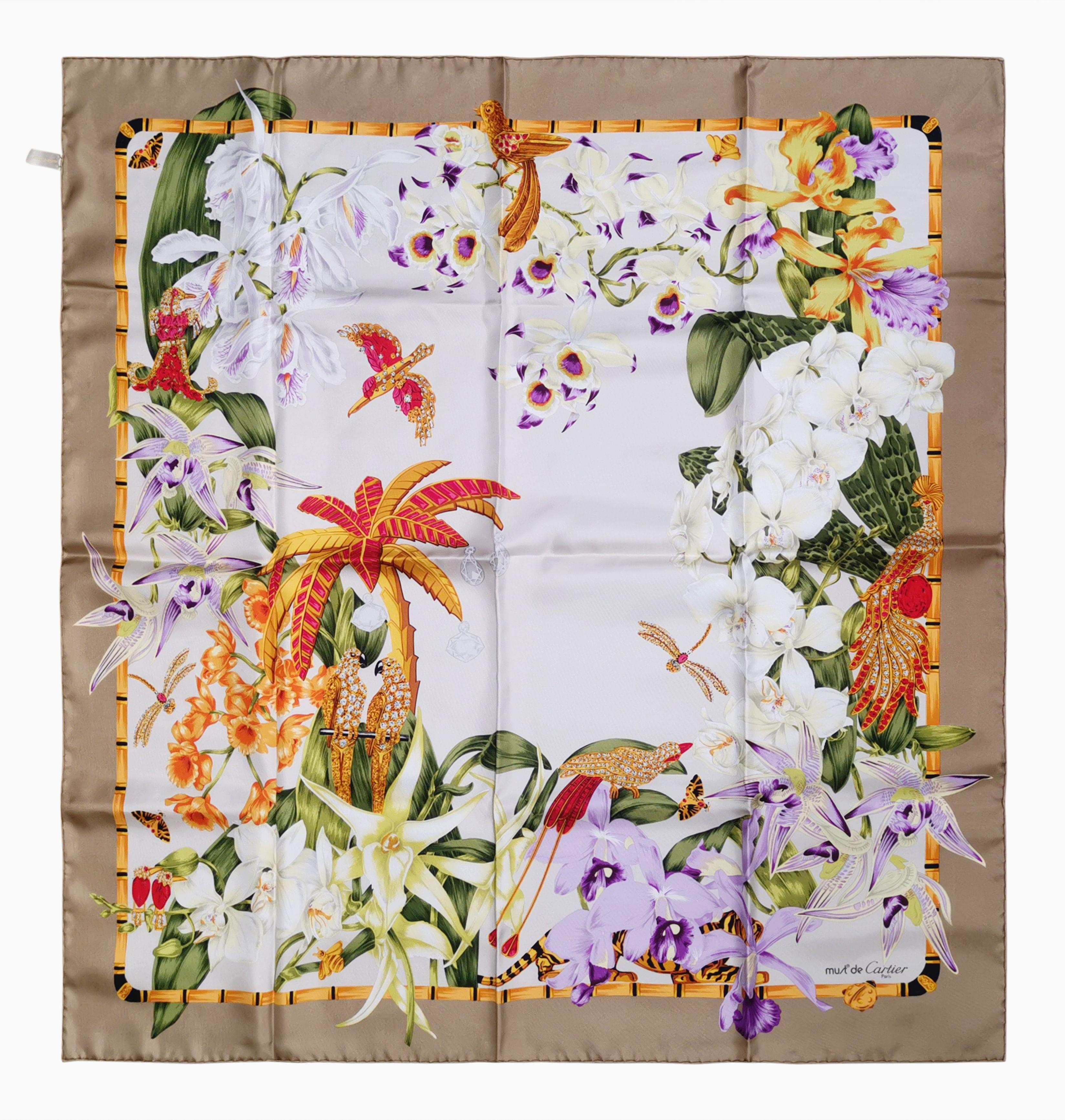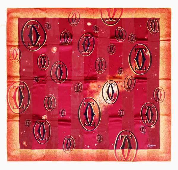 Le premier à décor de bijoux et fleurs sur fond ivoire et bordure beige, le deuxième à décor de médaillons monogrammés sur fond bordeaux et bordure orange, soie, 86x86 cm