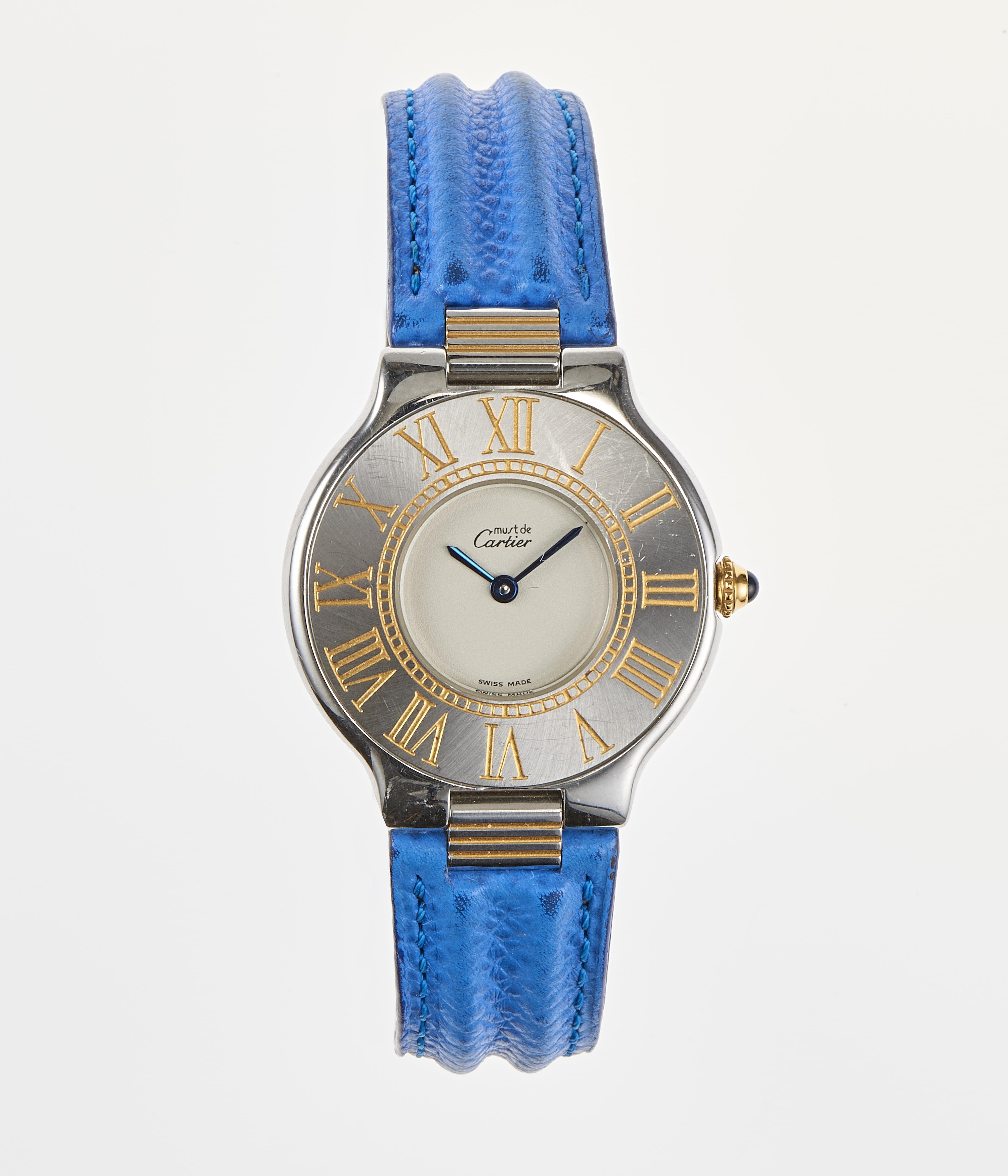 Cadran gris guilloché, aiguilles dorées, chiffres romains bleu c...