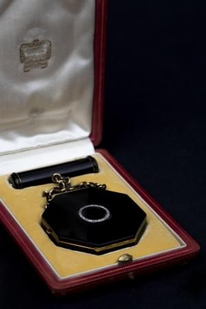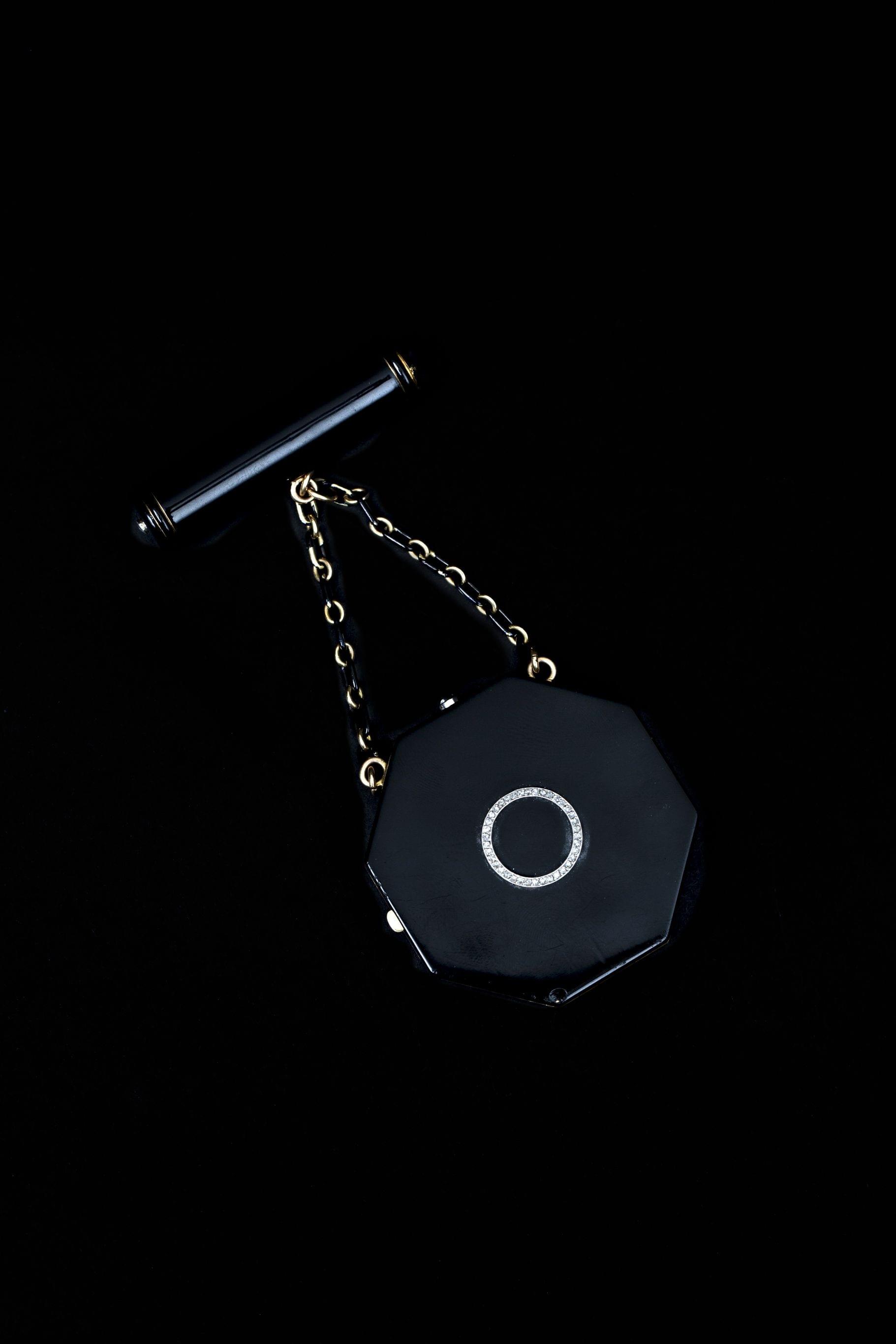 783. Cartier, nécessaire de beauté composé d'un rouge à lèvres serti de diamants en rose et d'un poudrier octogonal s'ouvrant sur un miroir et orné d'un motif rond serti de roses de diamant, circa 1910, or rose et or gris 750, onyx, poussoir serti d'un diamant en rose, H 12 cm, dans son écrin
