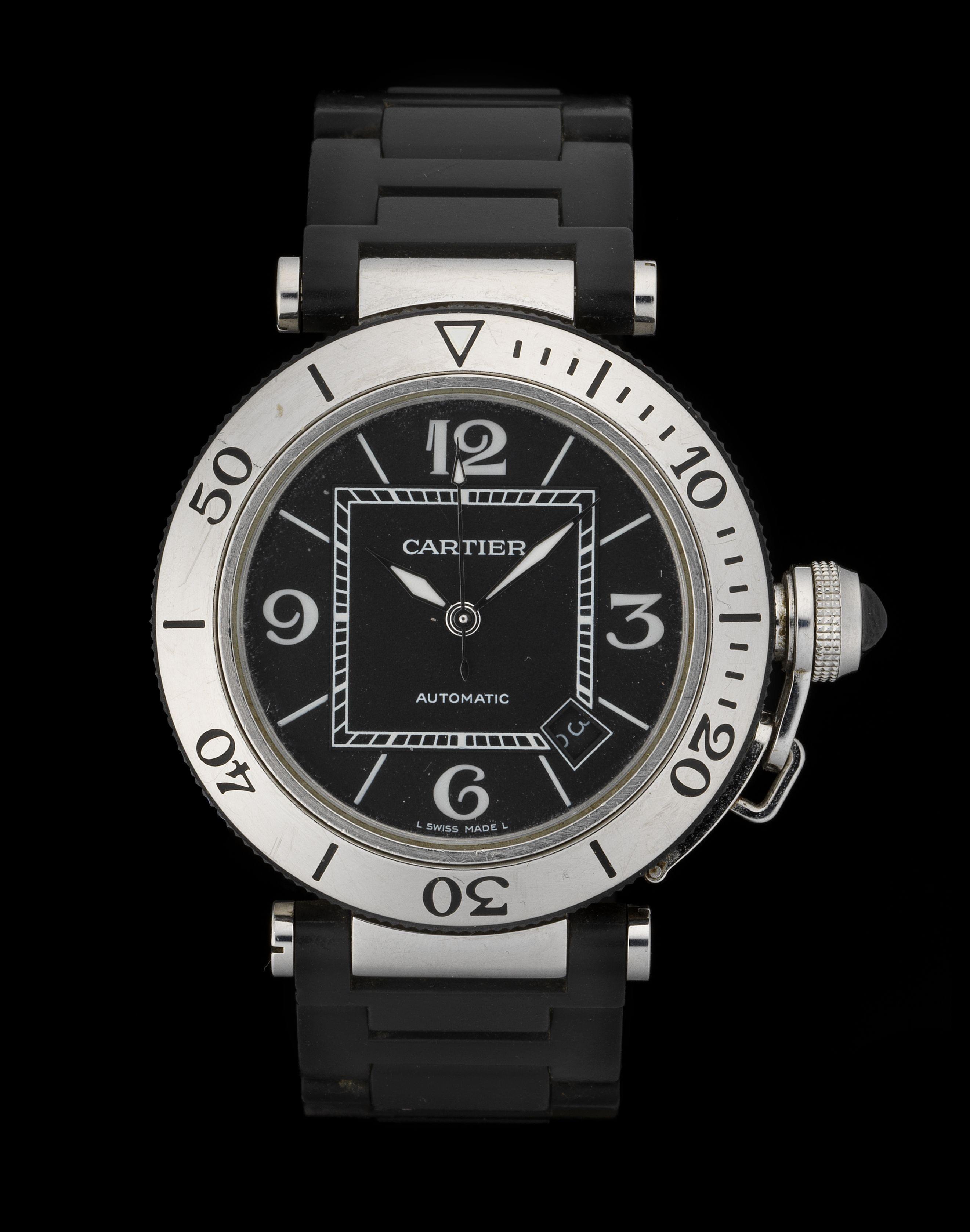 Cadran noir, aiguilles et chiffres arabes blancs, date à guichet entre 4h et 5h, acier et caoutchouc, D 41 mm