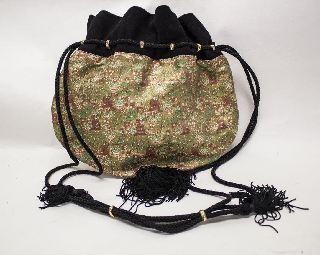 Soie brochée à décor oriental et à fond or, bandoulière agrémentée de pompons coulissant dans des anneaux en métal doré godronné à trois tons, 26x22 cm