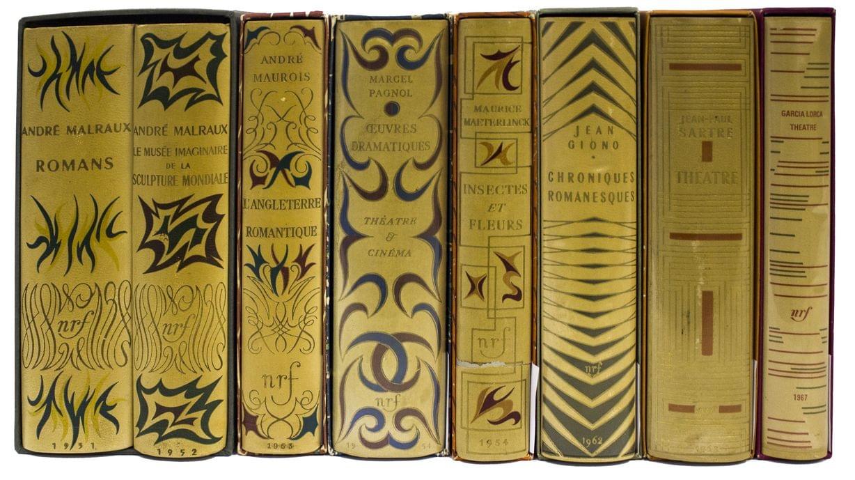 3482. -CARTONNAGES NRF. Ensemble de 8 vol. in-4°, cartonnage à décor réalisé d'après les dessins de Paul BONET, HOLLENSTEIN.