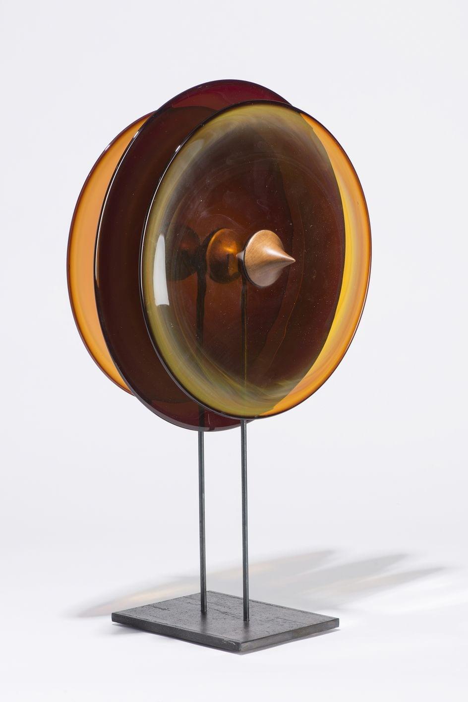 Funambule, noyer tourné et disques de verre, monture en métal, H 61 cm