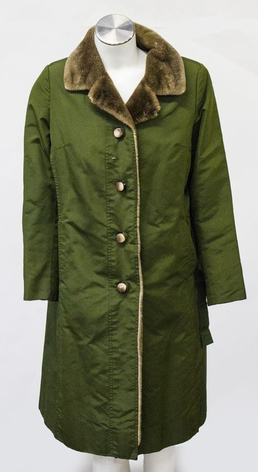 Pelisse, microfibre verte, intérieur fourrure, deux poches latérales, fermeture boutons