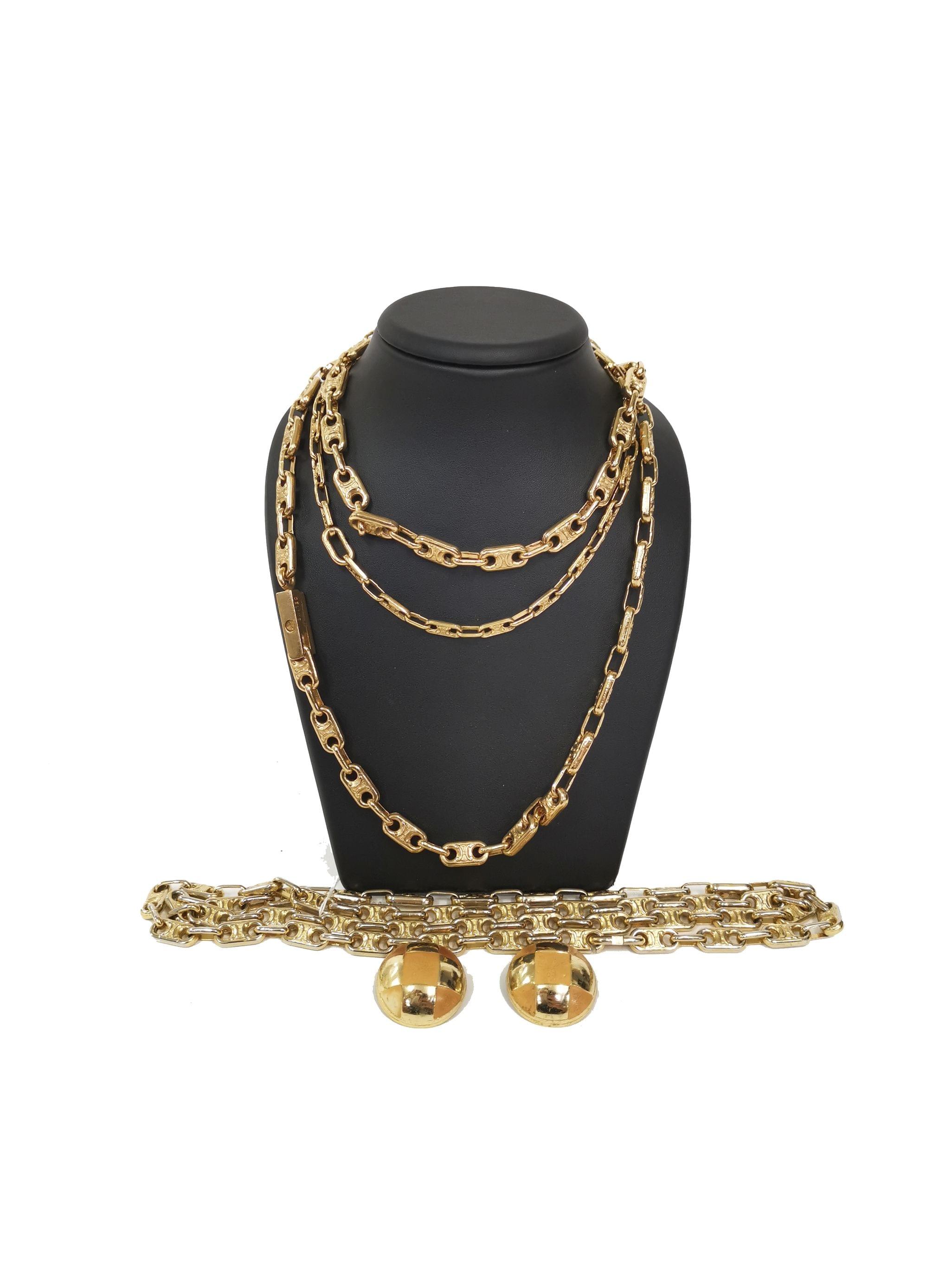3069. Céline et Lanvin, lot de trois colliers monogrammés dont deux sautoirs, et de clips d'oreilles à motif de damier