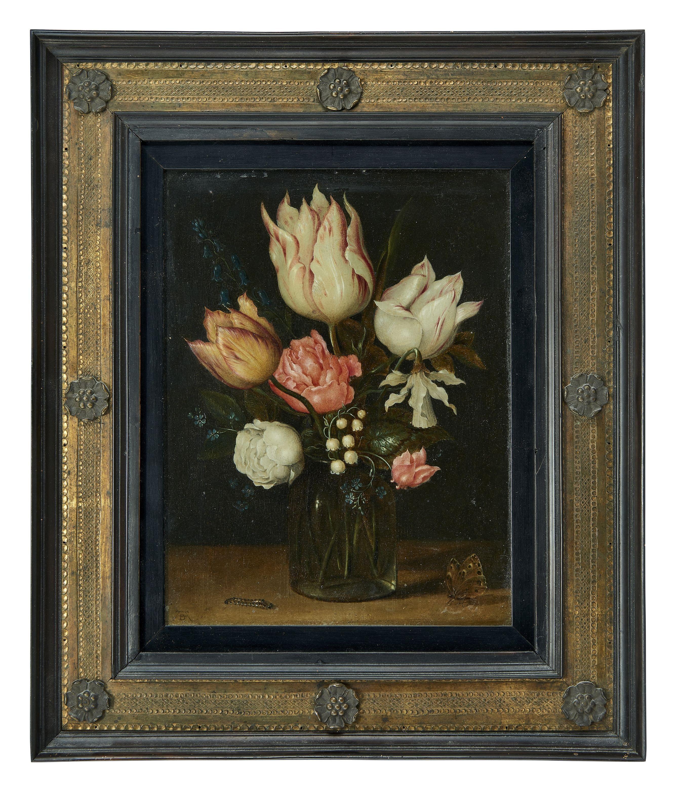 Fleurs dans un vase, chenille et papillon, huile sur cuivre, circa 1610, monogrammée AB, 22,5x16,5 cm.