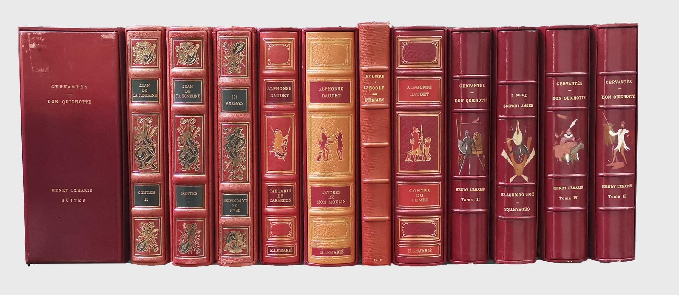 5160. - CERVANTES : Don Quichotte. Paris, s. d.; Les Heures Claires, ill. LEMARIE, 4 vol. in 8°, demi chag. rouge à coins, dos orné, ex. num. complet du vol. des suites et décompositions.