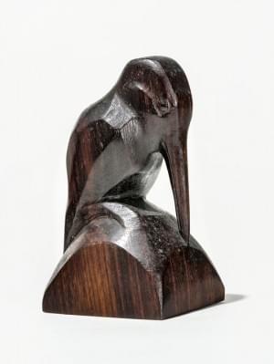 Lapin et canard, deux sujets en bois sculpté, signé, H 10 et 15...