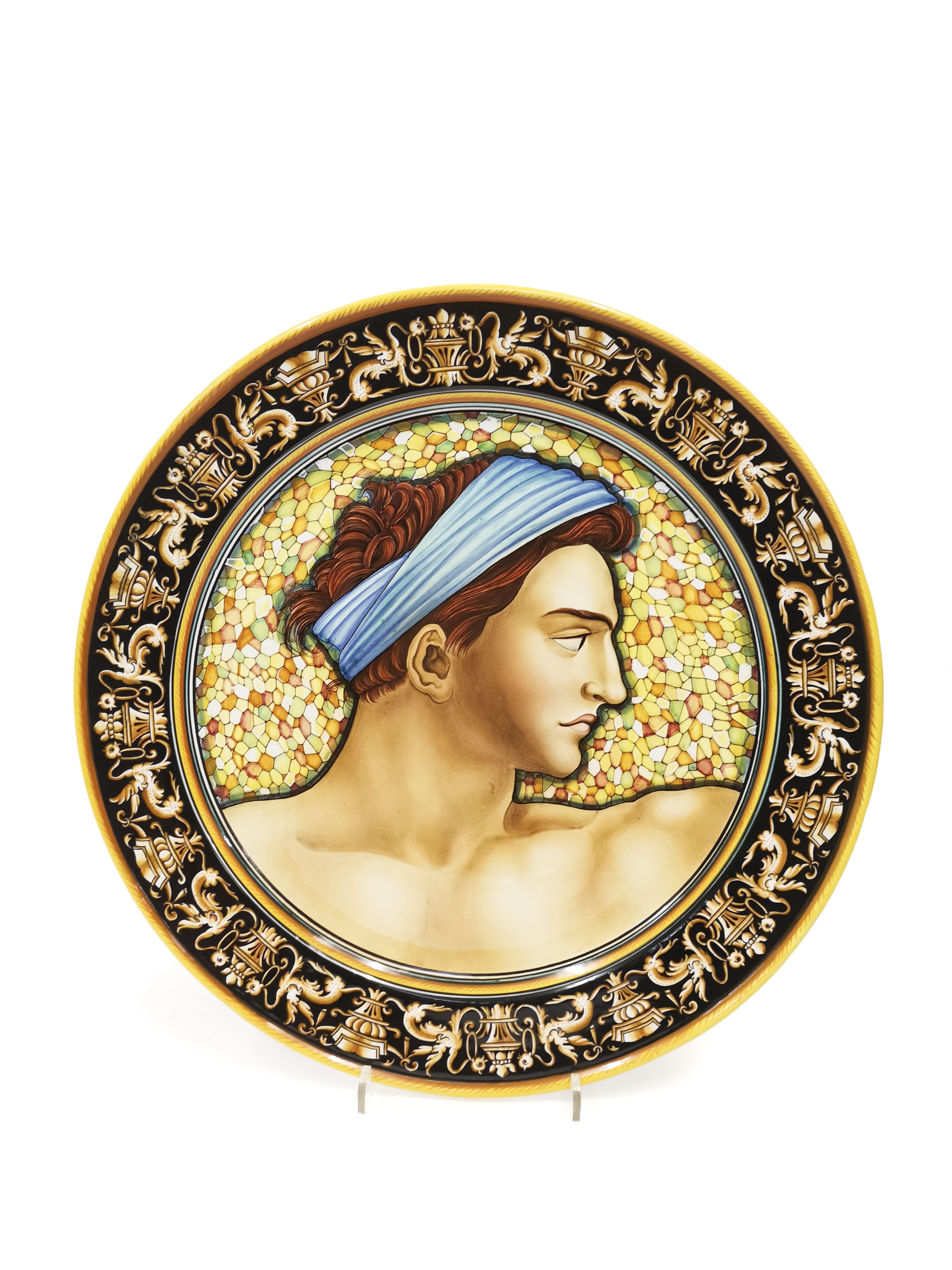 Deruta, grand plat à décor d'un profil d'après Michelange, céramique émaillée, D 48 cm