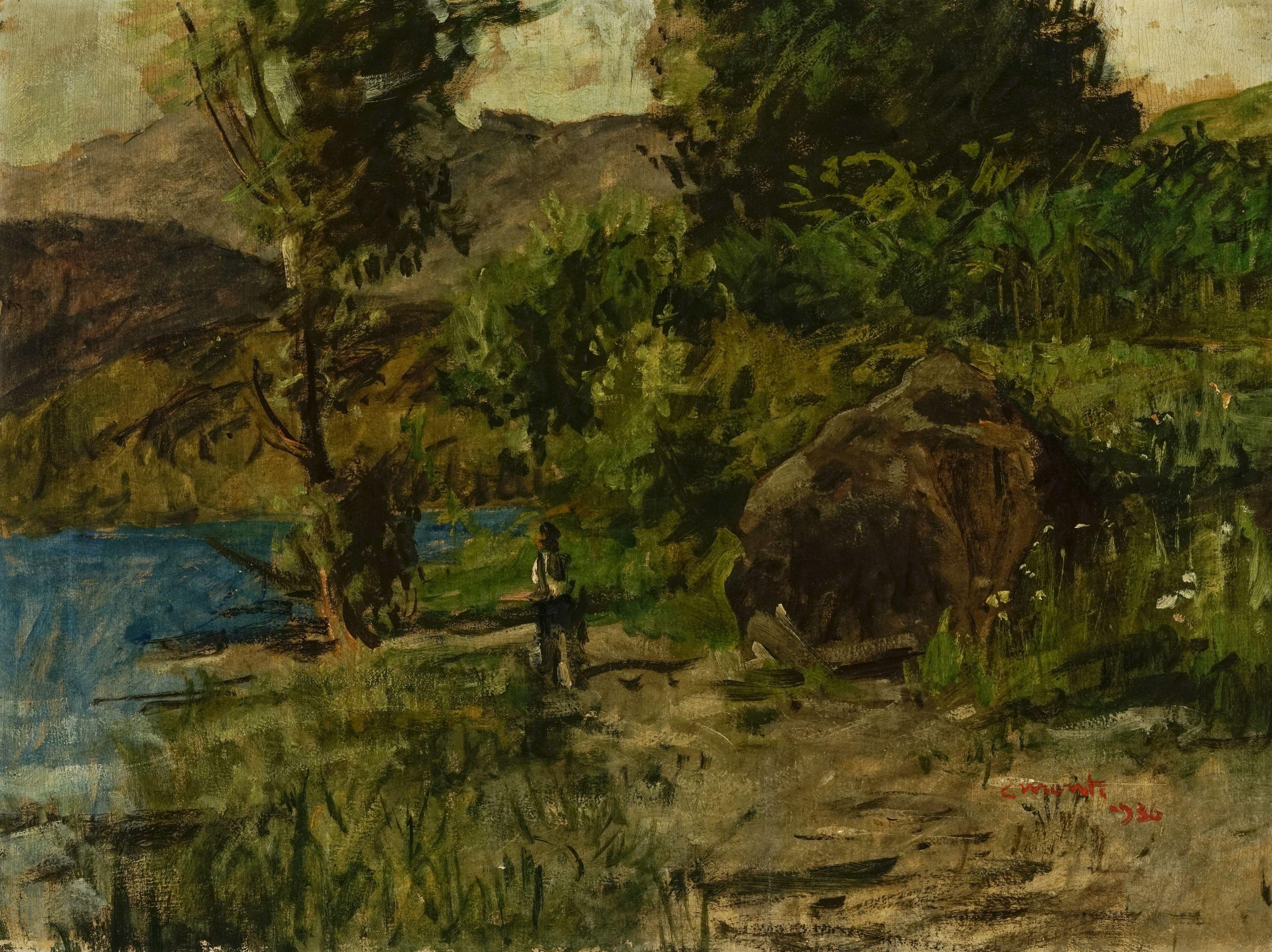 Berger dans la campagne, huile sur toile signée et datée 1936, 60x80 cm