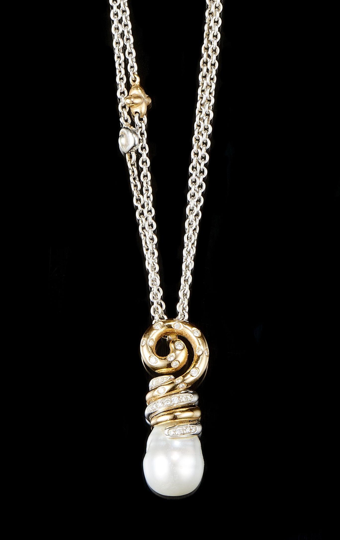 81. Chaîne à double maille forçat retenant un pendentif bicolore serti d'une perle (D env. 13 mm) rehaussée de diamants