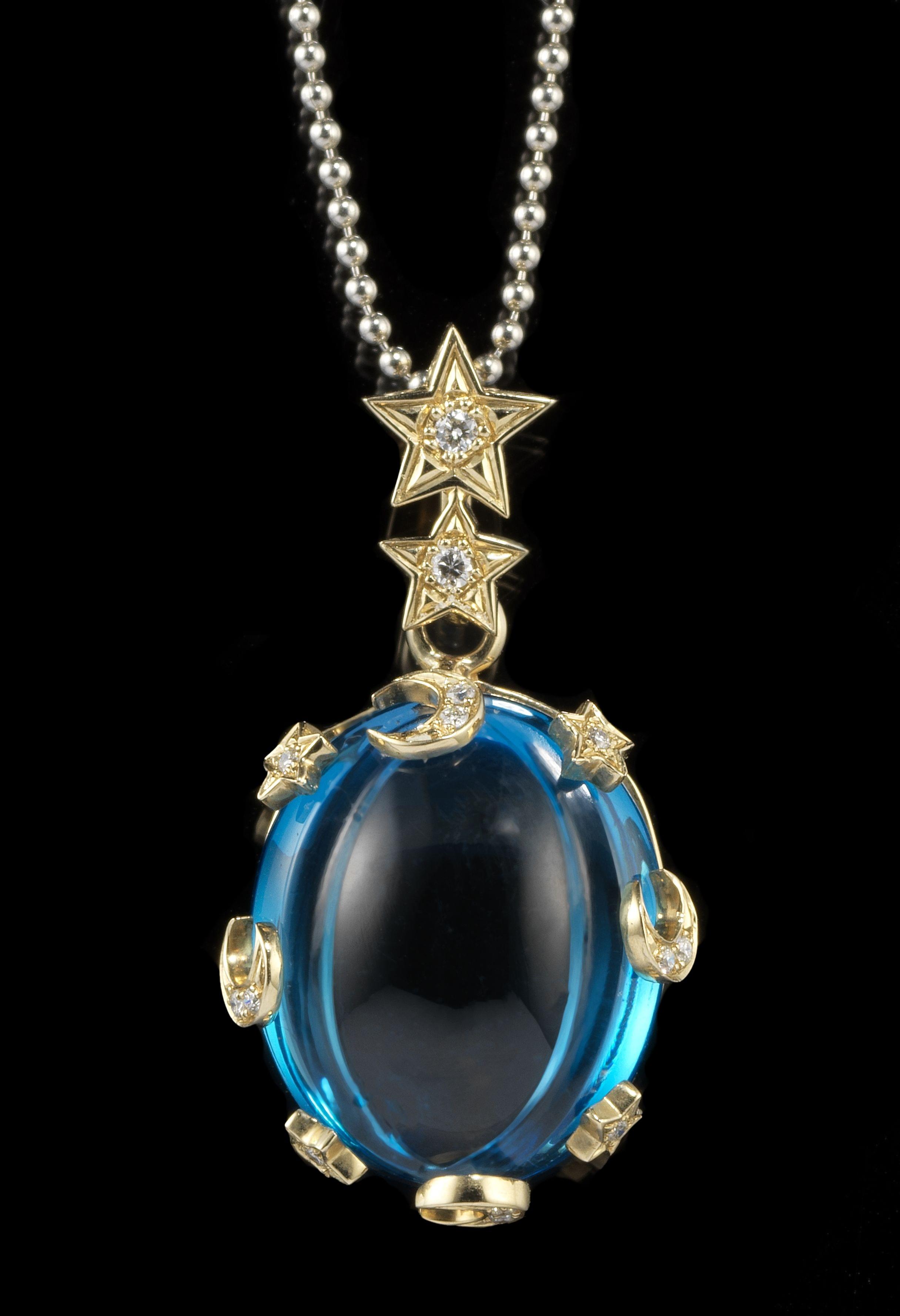 Entourée de motifs de Lune et d'étoiles sertis de diamants, chaîne en platine 850 et pendentif en or 750, L 37 ou 41 cm, H 3 cm, poids brut 10 g. Pour les lots précédés d'un *, la TVA de 7,7% est due sur l'entier du prix d'adjudication.