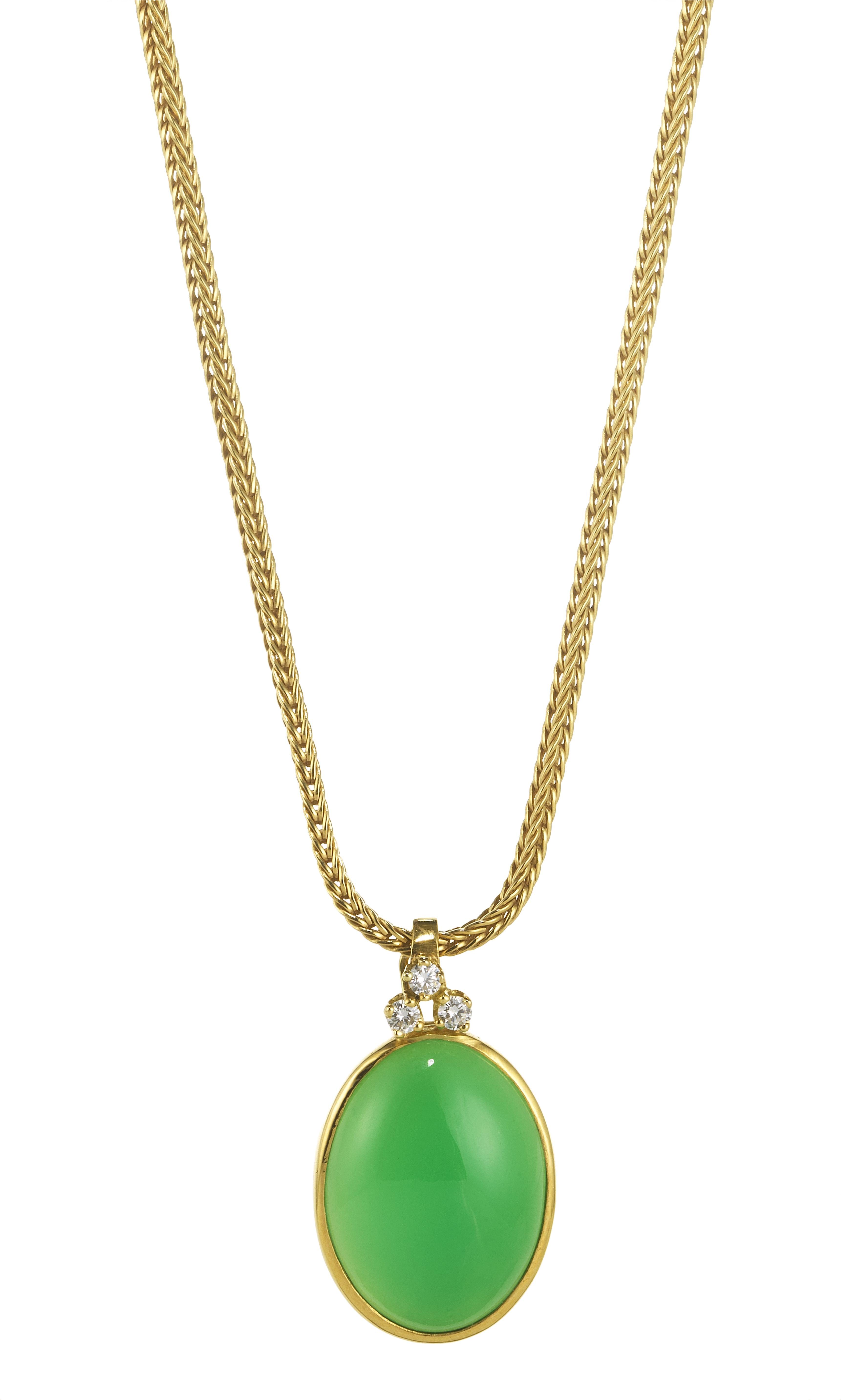 3416. Chaîne à maille colonne retenant un pendentif serti d'une chrysoprase taille cabochon ovale rehaussée de trois diamants