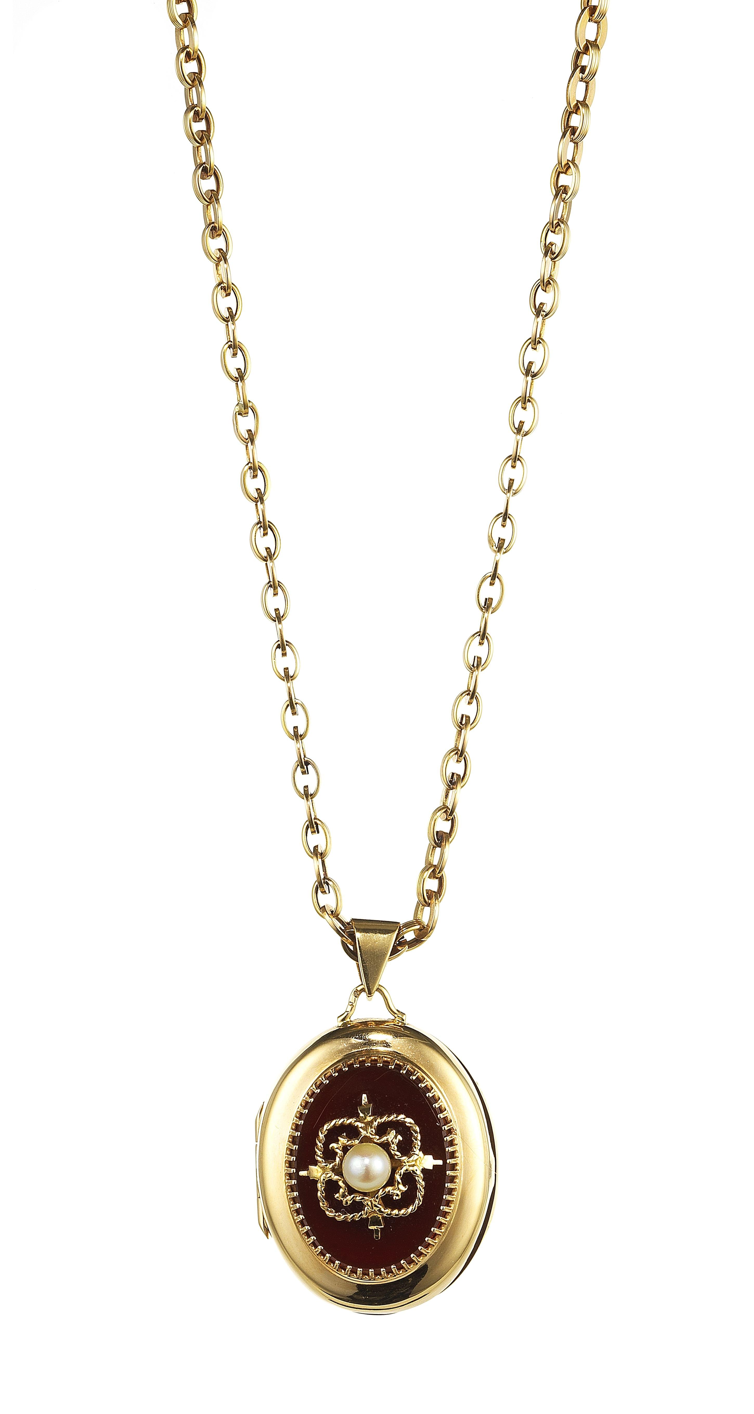 3355. Chaîne à maille ovale stylisée retenant un médaillon porte-photo serti d'une plaque de cornaline rehaussée d'une perle