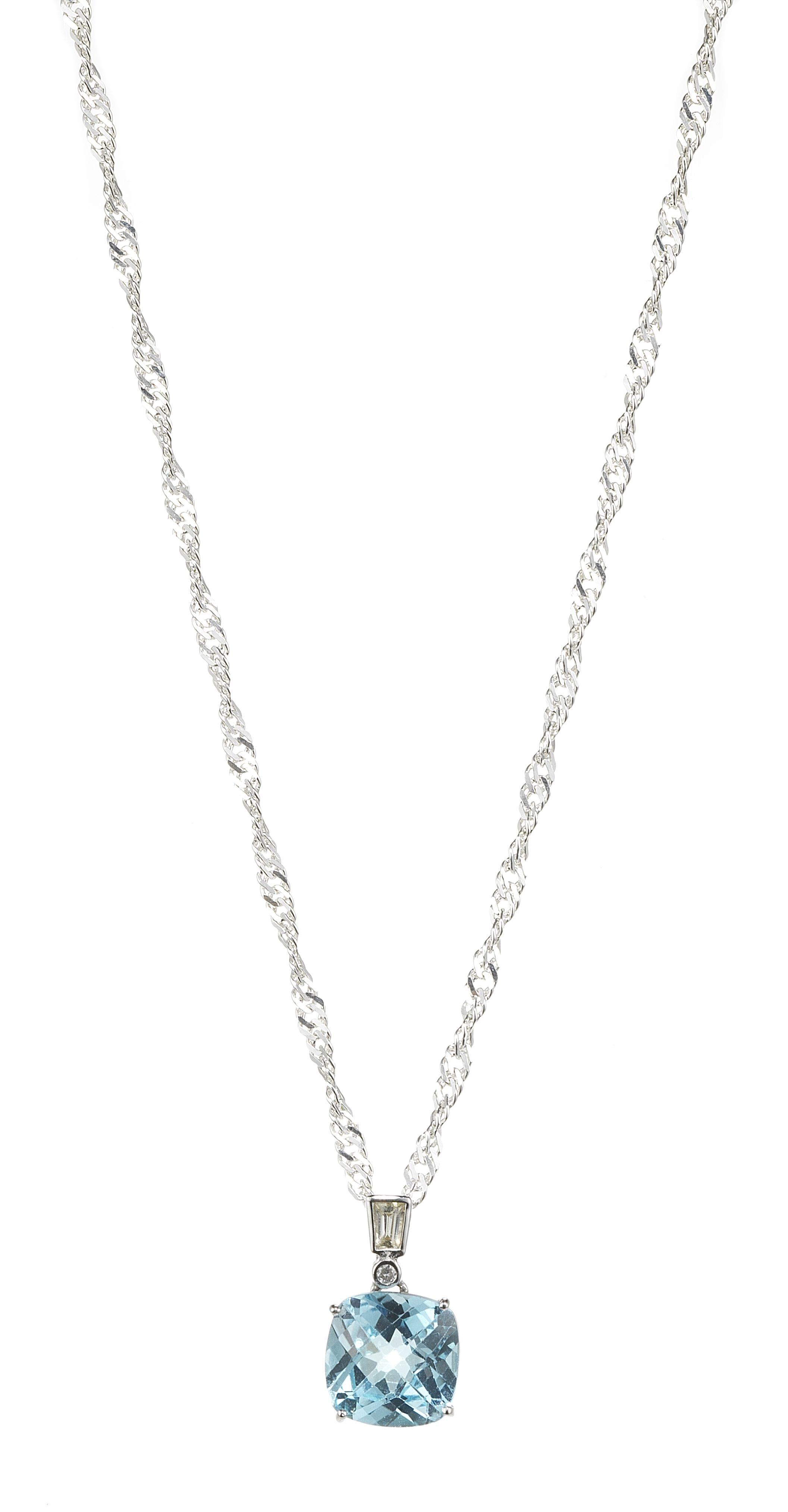 3059. *Chaîne à maille torsadée retenant un pendentif serti d'une topaze bleue taille coussin facettée (env. 3,5 ct) rehaussée de saphirs blancs