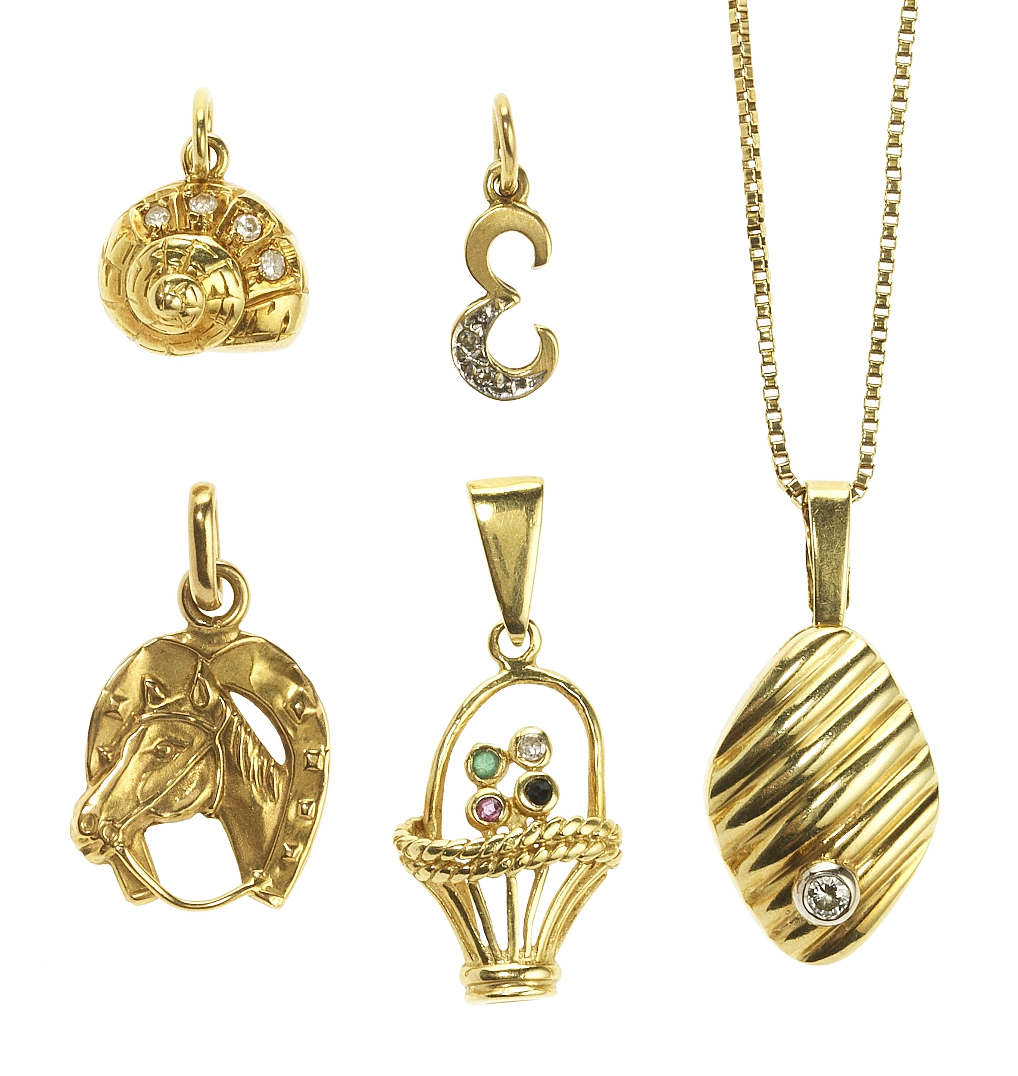 Dont un fer à cheval, un 3 serti de diamants, un panier rehaussé d'un saphir, un rubis, une émeraude et d'un diamant, un coquillage pavé de diamants et un losange godronné serti d'un diamant, or 750, L 60 cm, 9 g