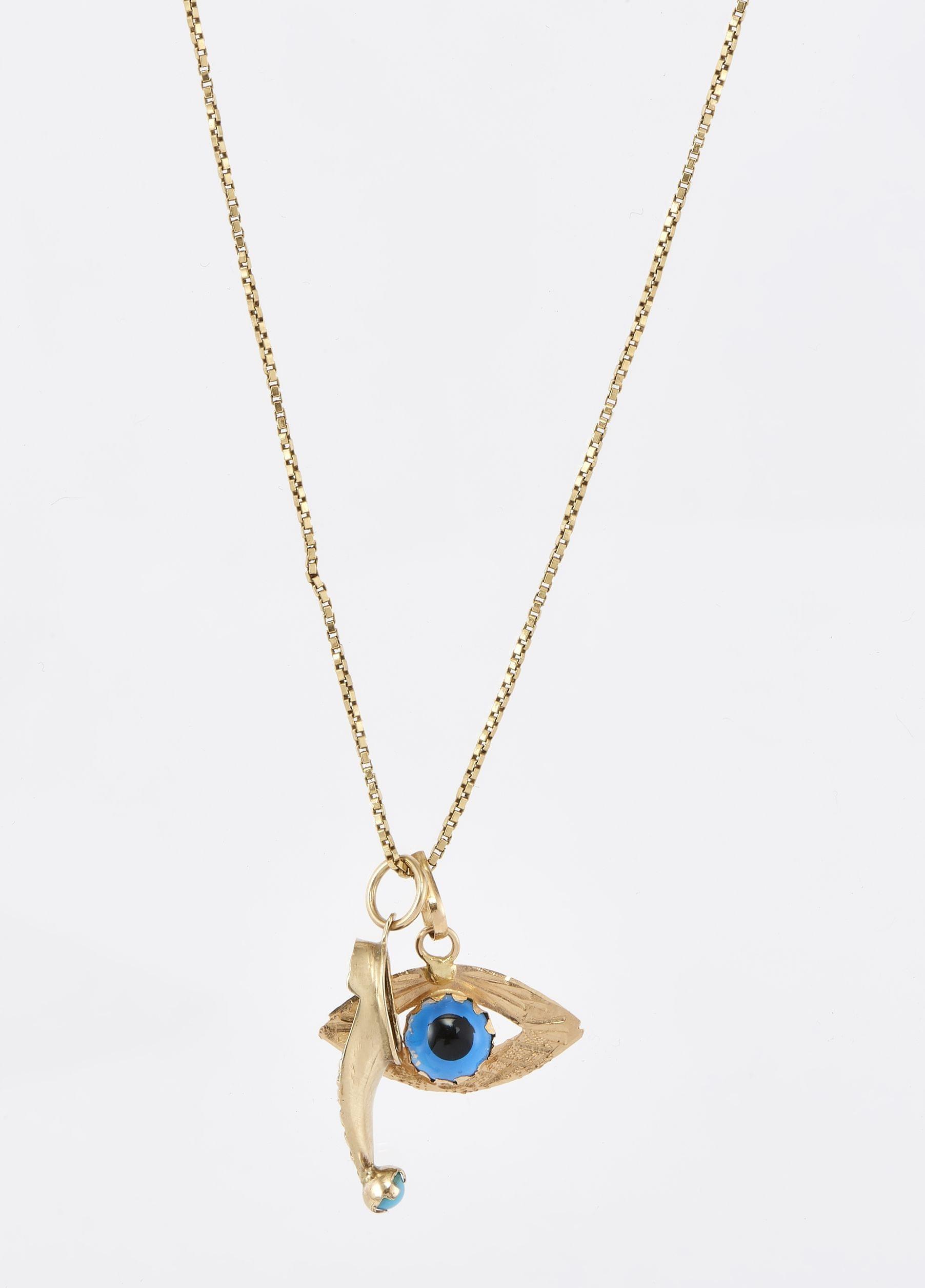 3252. Chaîne à maille vénitienne retenant un pendentif "œil" et un pendentif à motif de chaussure