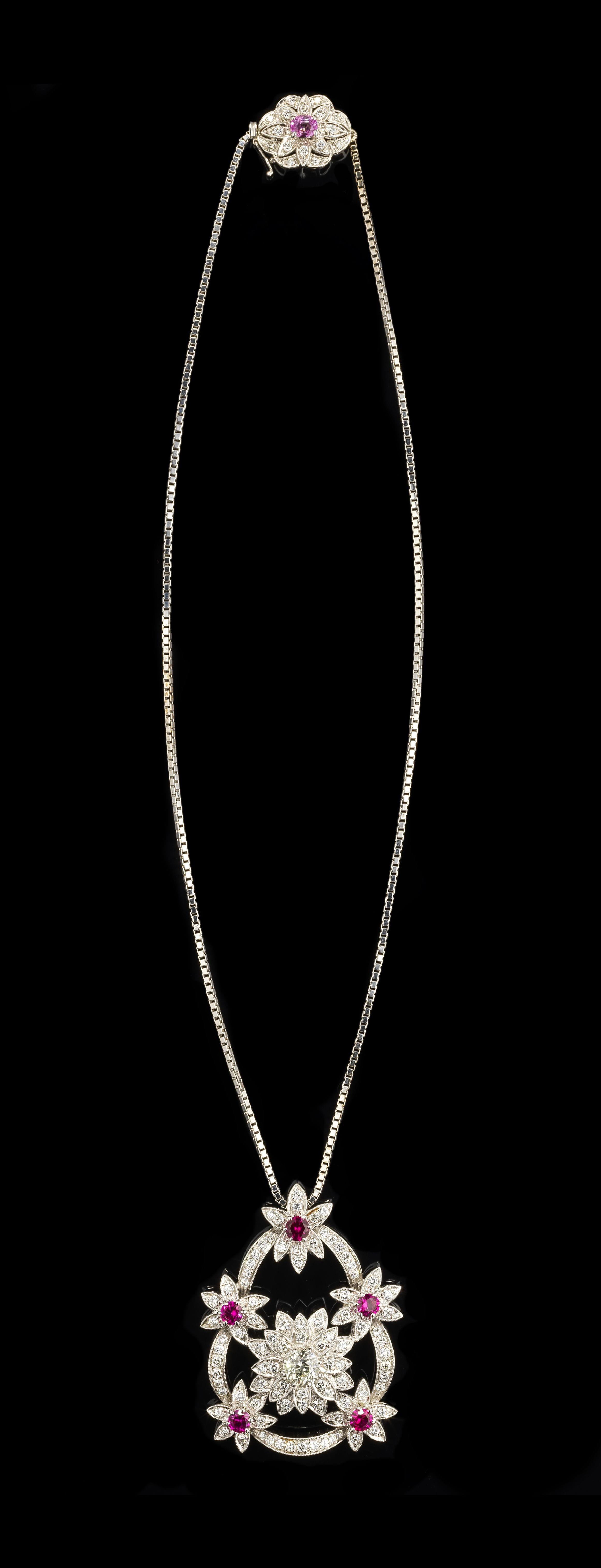 Entouré de rubis taille brillant (env. 1,5 ct) et de diamants et terminé par un fermoir centré d'un saphir rose taille ovale (env. 0,6 ct) et pavé de diamants, travail italien, or gris 750, L 43 cm, poids brut 28 g