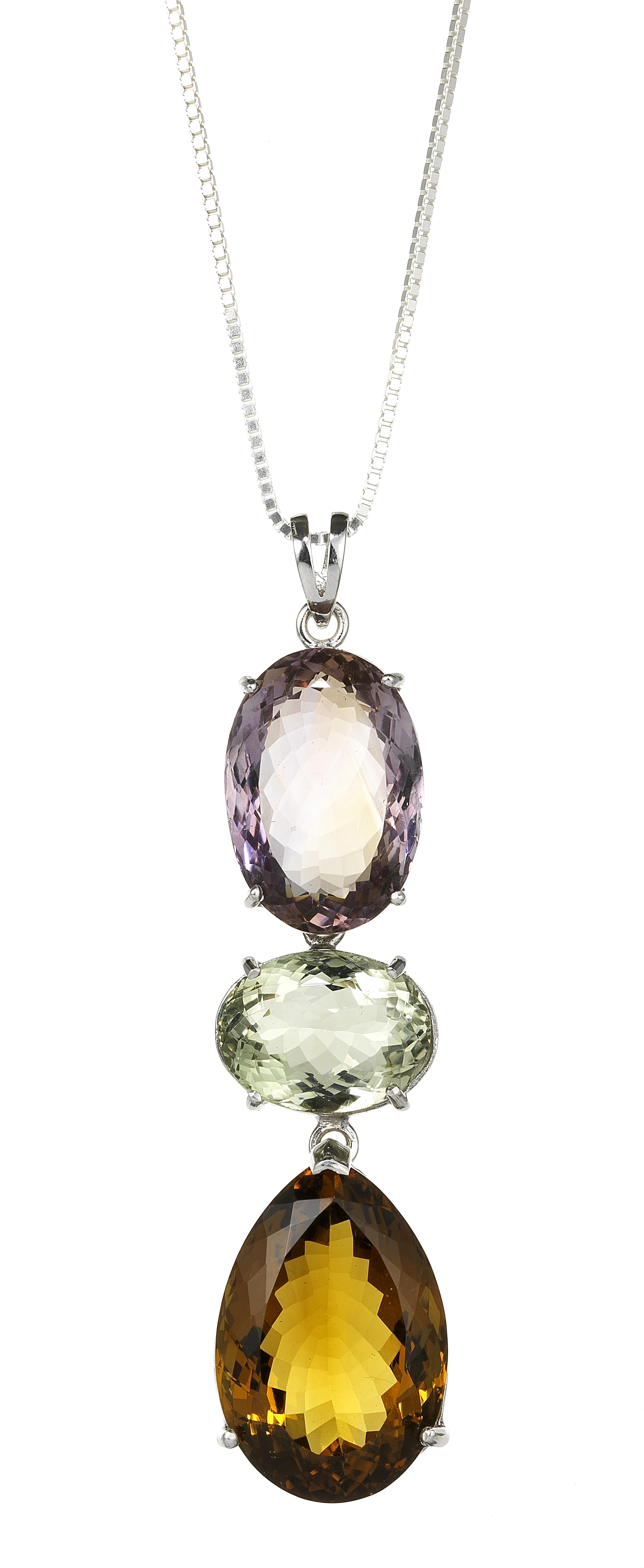 3340. *Chaîne à maille vénitienne retenant un pendentif serti d'une améthyste, d'une prasiolite et d'une citrine taille ovale