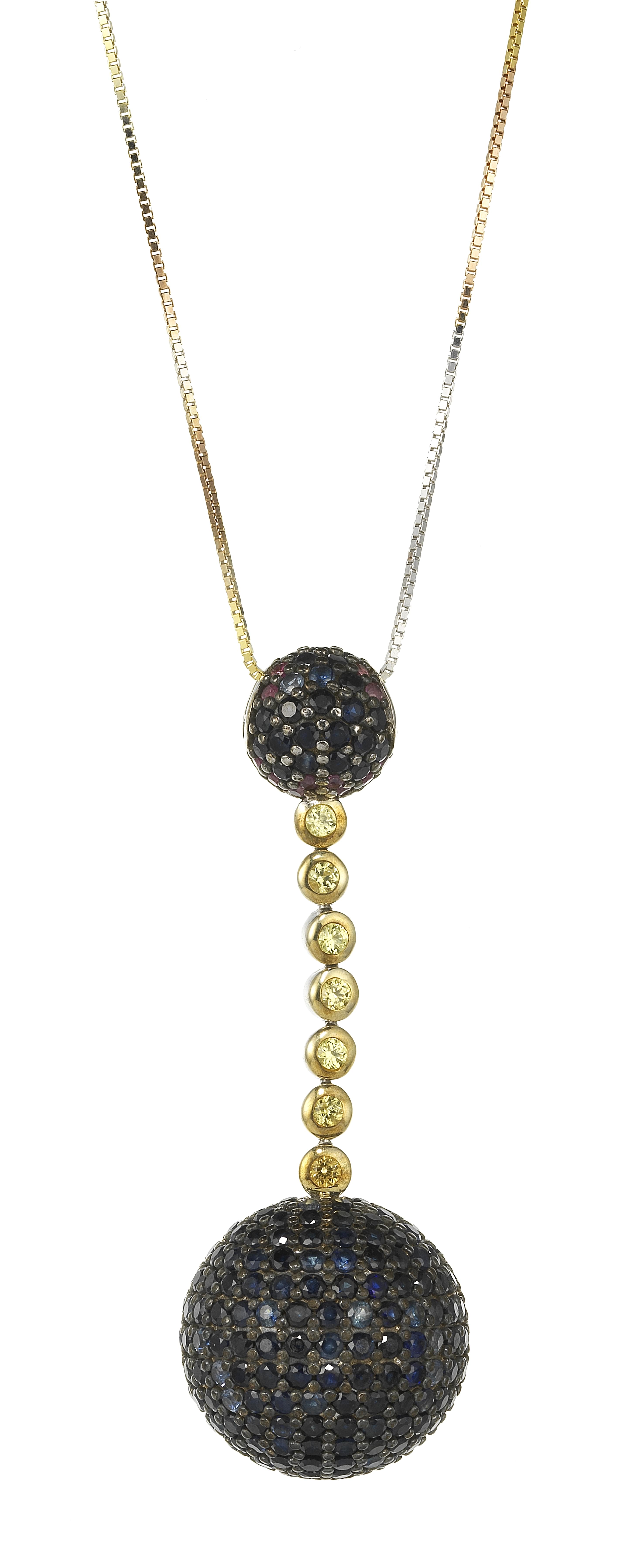 3094. *Chaîne à maille vénitienne tricolore retenant un pendentif pavé de saphirs