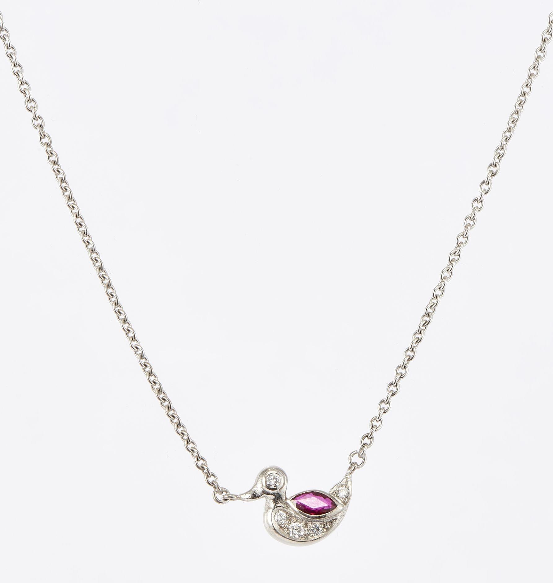 3276. Chaîne retenant un pendentif à motif de canard à l'aile sertie d'un rubis et rehaussé de diamants