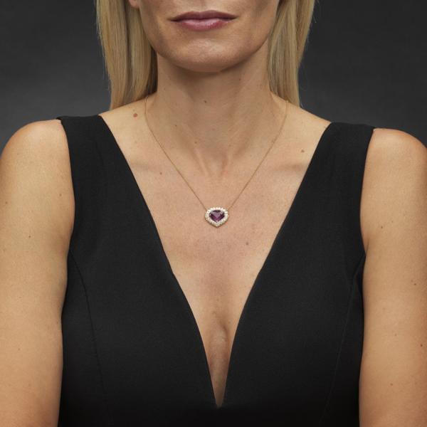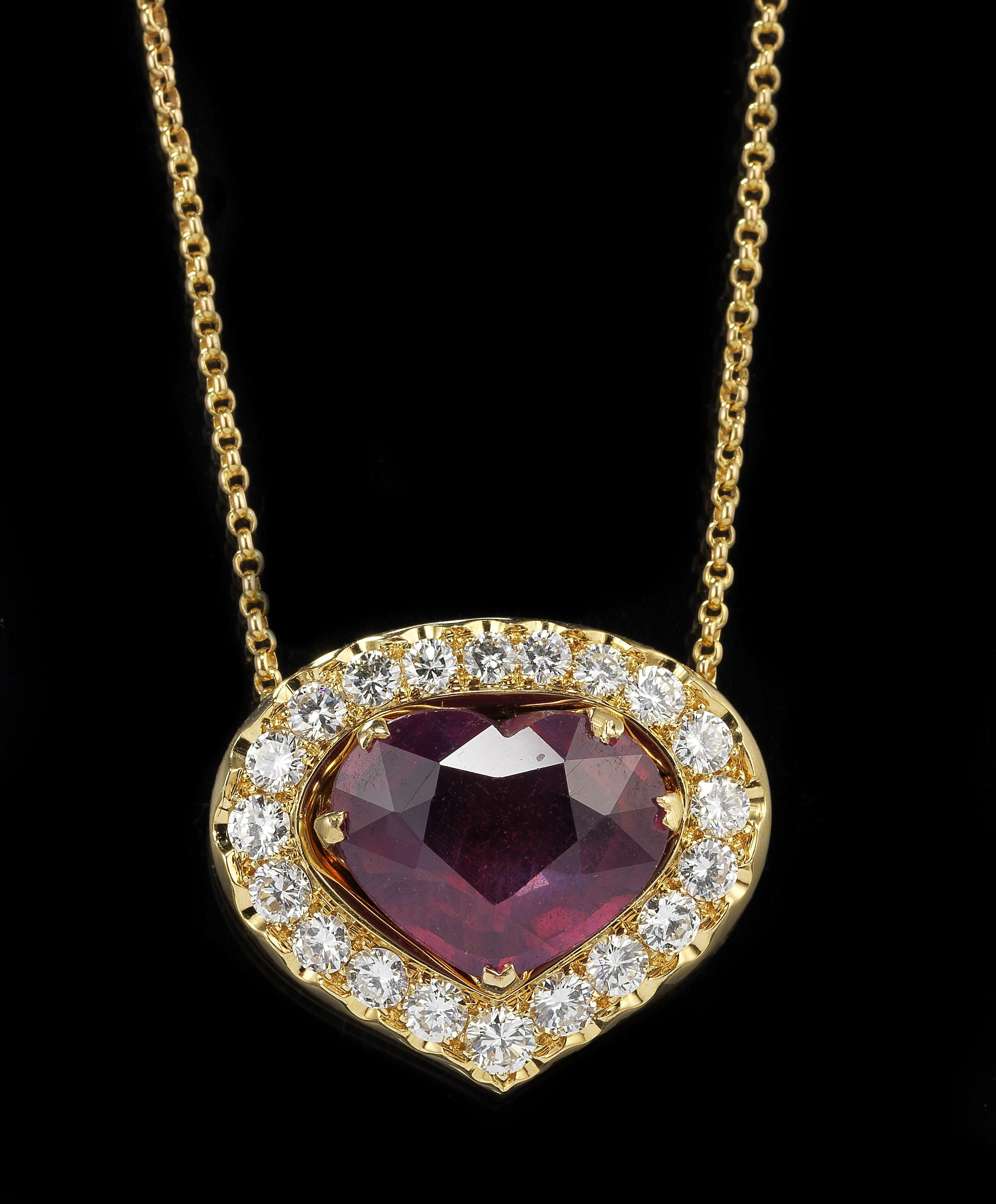 104. Chaîne retenant un pendentif serti d'un rubis taille cœur (env. 9,7x11,8 mm) entouré de diamants (env. 1 ct)