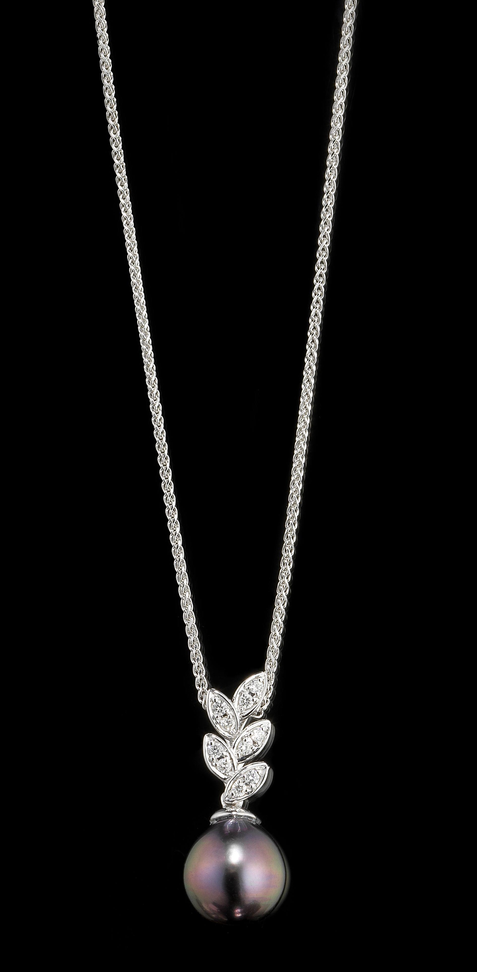 3369. Chaîne retenant un pendentif serti d'une perle de Tahiti en goutte (D evnv. 8,8 mm) surmonté d'un motif feuillagé pavé de diamants