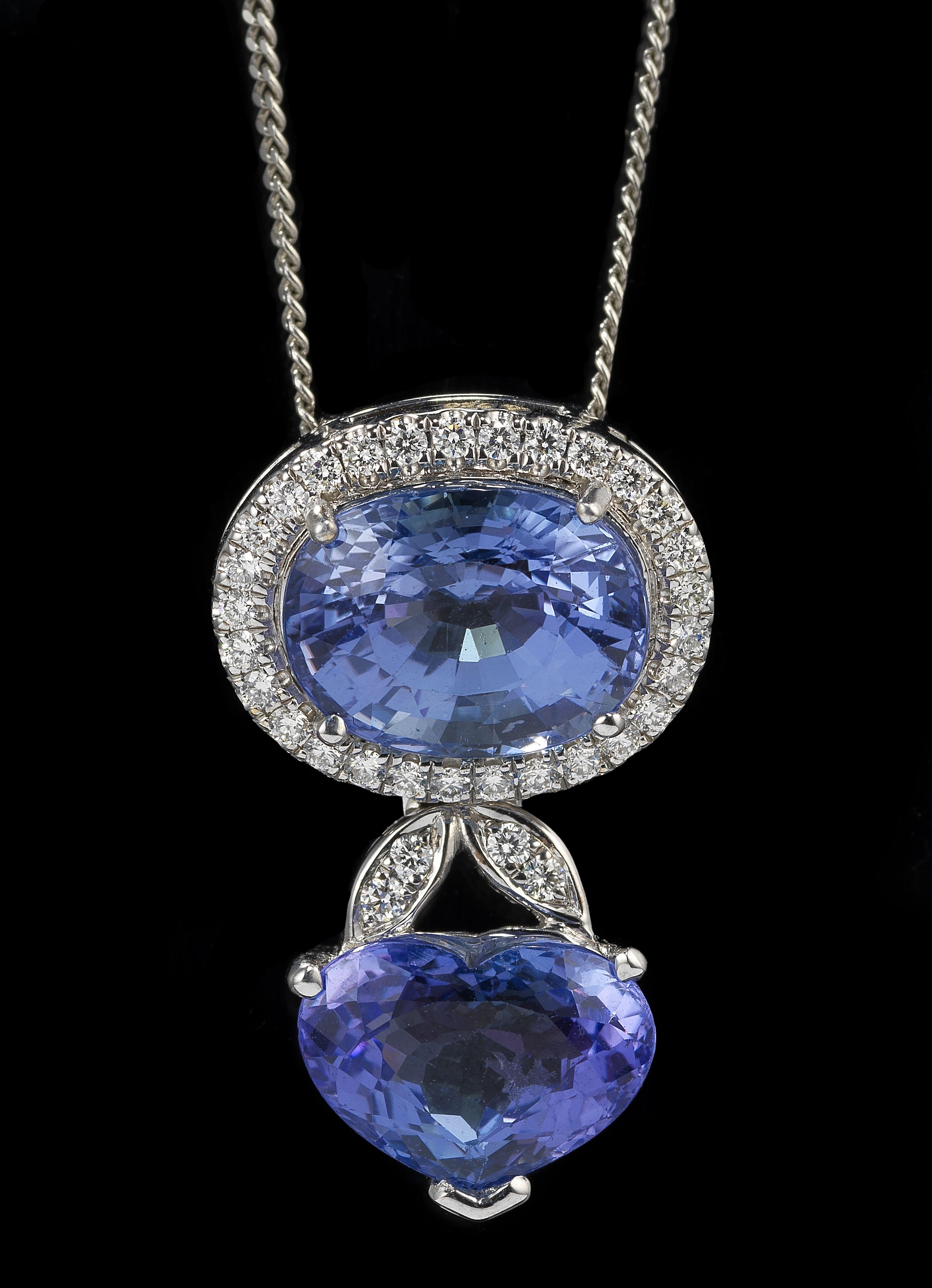 70. *Chaîne retenant un pendentif serti de deux tanzanites entourées et rehaussées de diamants, l'une taille ovale (5,08 ct) et l'autre taille