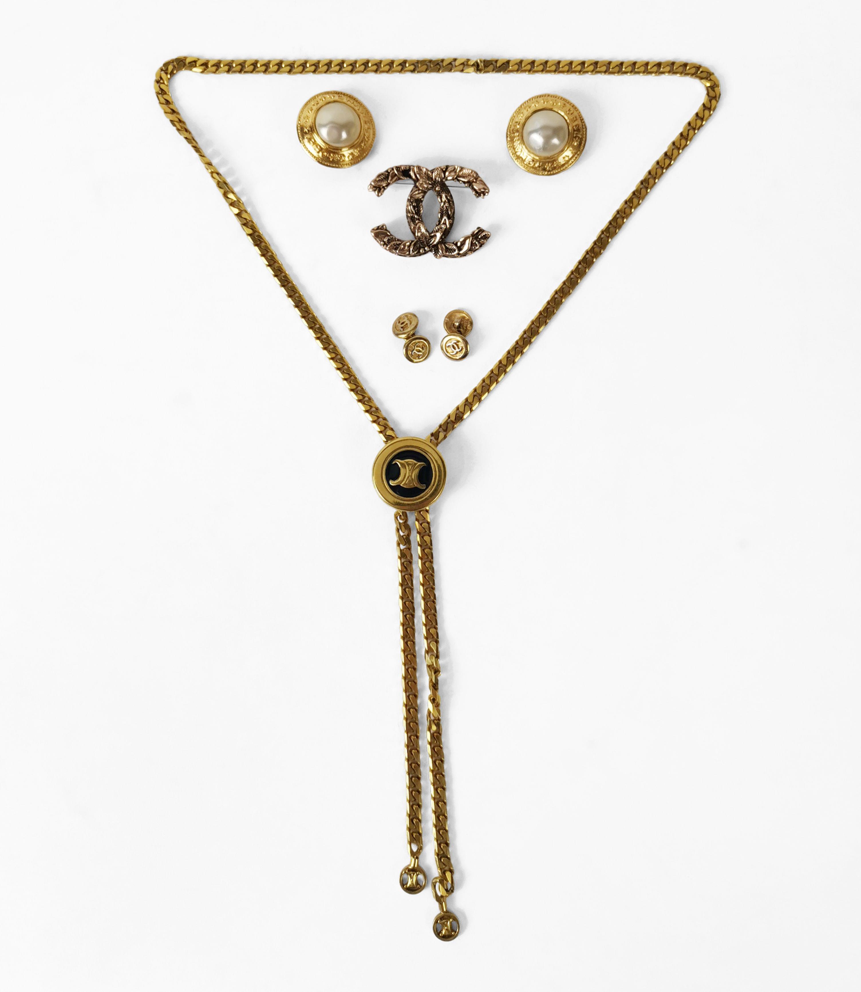Une paire de clips d'oreilles ronds centrés de perles d'imitation, une broche à motifs feuillagés et une paire de boutons de manchettes, métal doré, D 3 cm, H 3,5 cm. On joint un collier Céline à maille gourmette et longueur ajustable, L totale env. 90 cm.