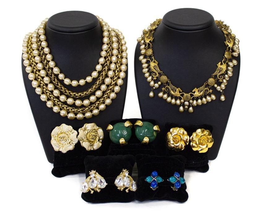 3162. Chanel, lot d'un collier multi-rangs de perles alternés de maille palmier et de deux paires de clips d'oreilles