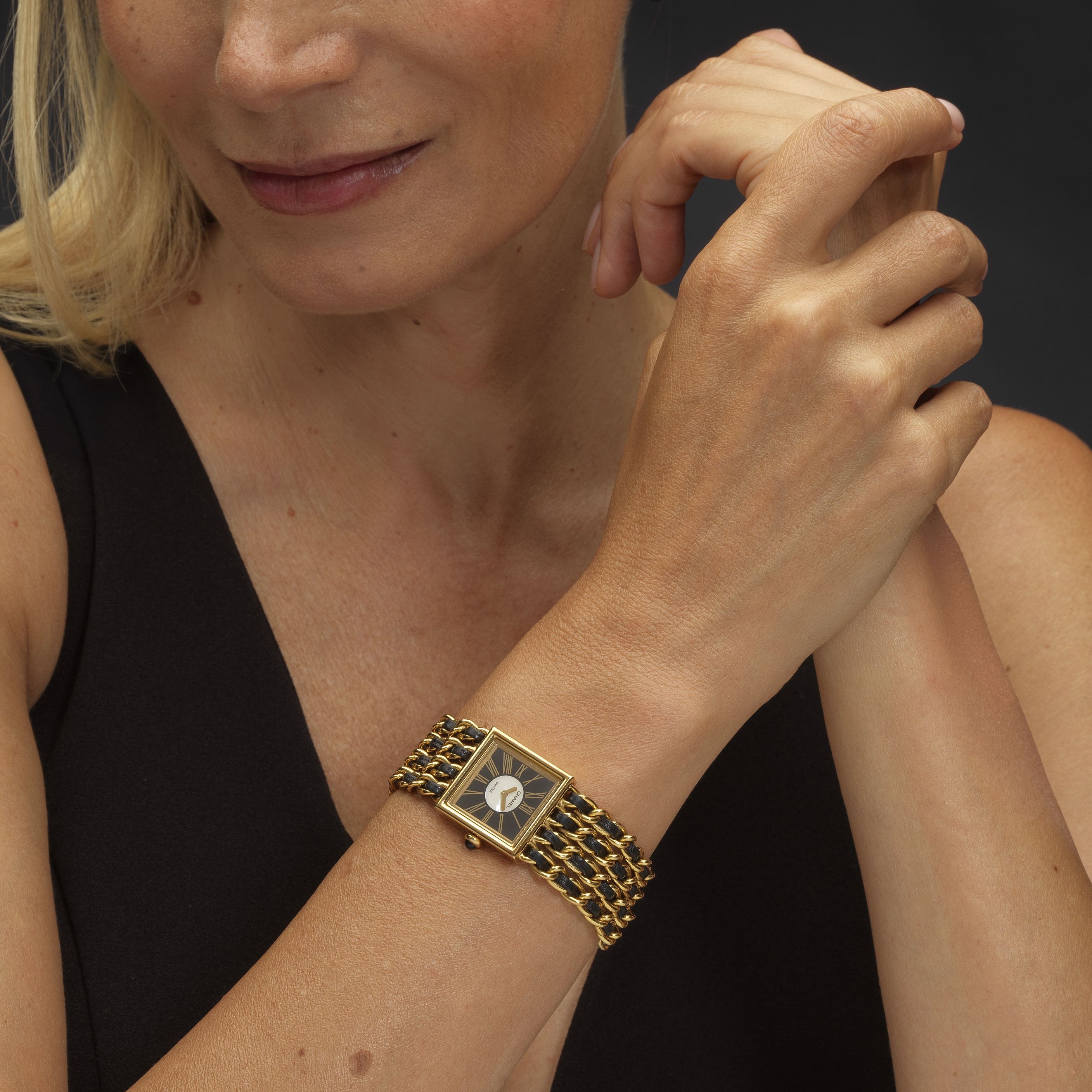 Cadran noir matelassé, aiguilles dorées, bracelet effet matelass...
