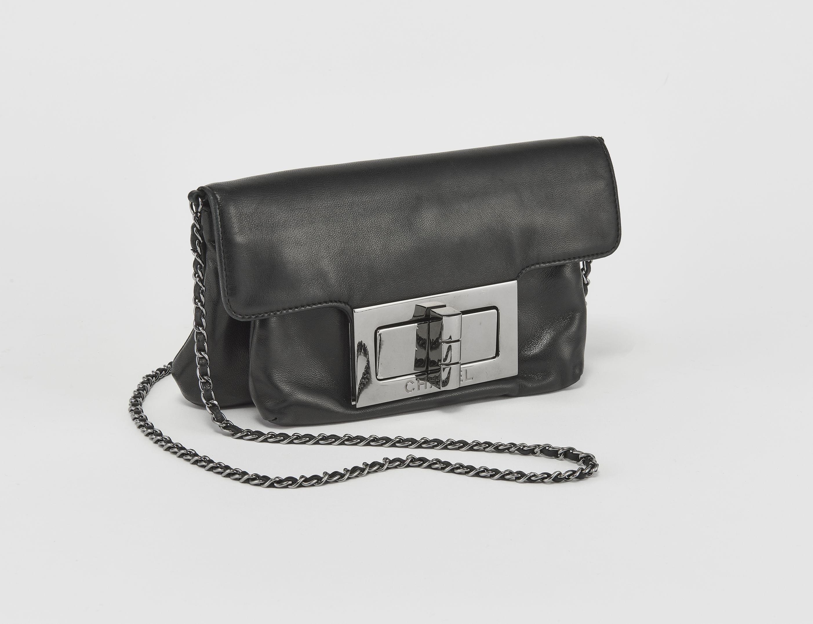 Cuir lisse noir, intérieur en toile imprimée noire, garniture en métal argenté, bandoulière à maille gourmette garnie de cuir noir, 13x20 cm