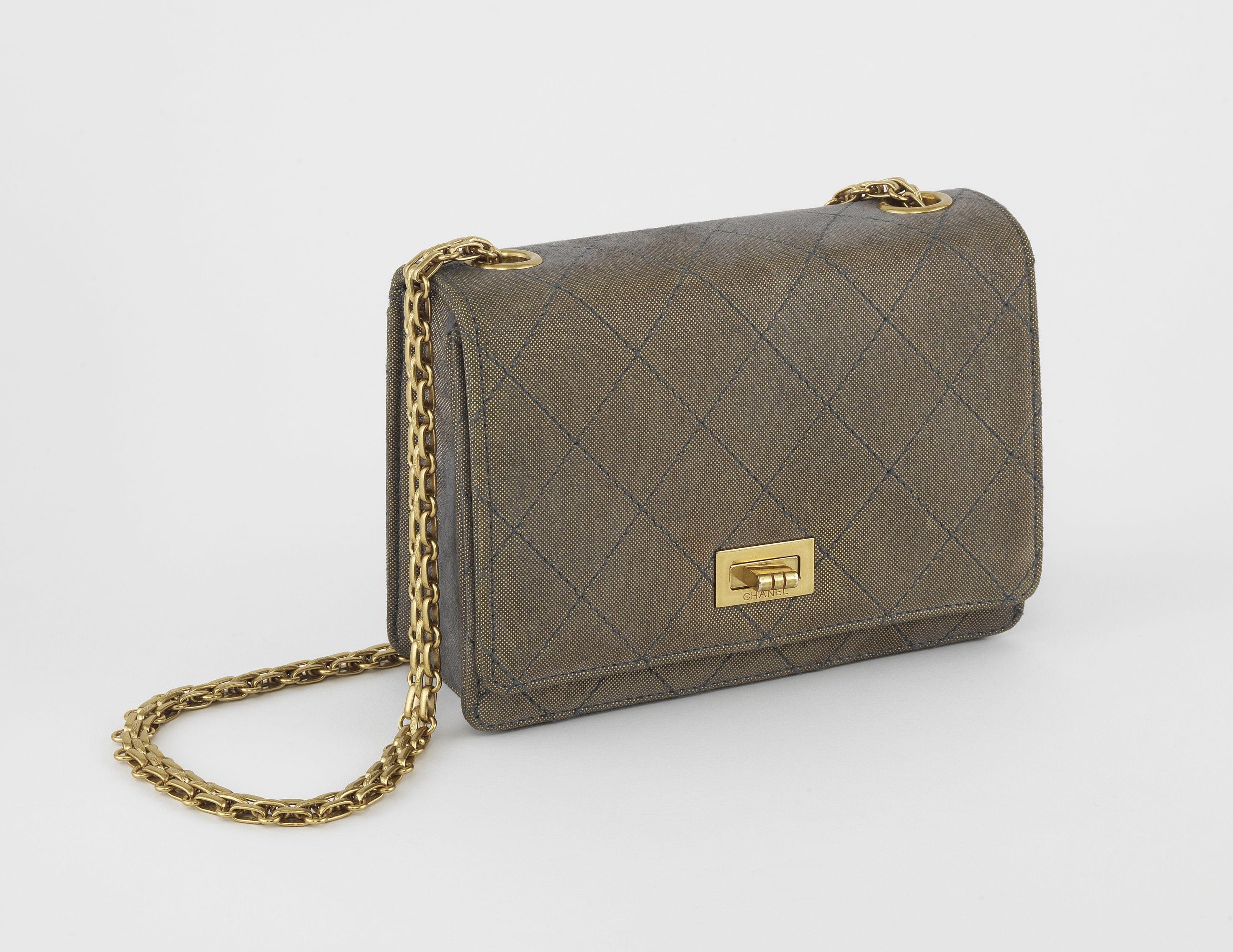Soie dorée et surpiqûres quadrillées, rabat plaqué à fermeture à bouton siglé, intérieur en cuir gris avec une poche latérale, poche latérale arrière et garniture dorée, 18x14x7 cm