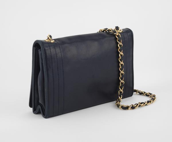 Cuir bleu, rabat plaqué siglé à fermeture à bouton pression, anse en bandoulière, intérieur avec poche latérale zippée, garniture dorée, 20x13x5 cm