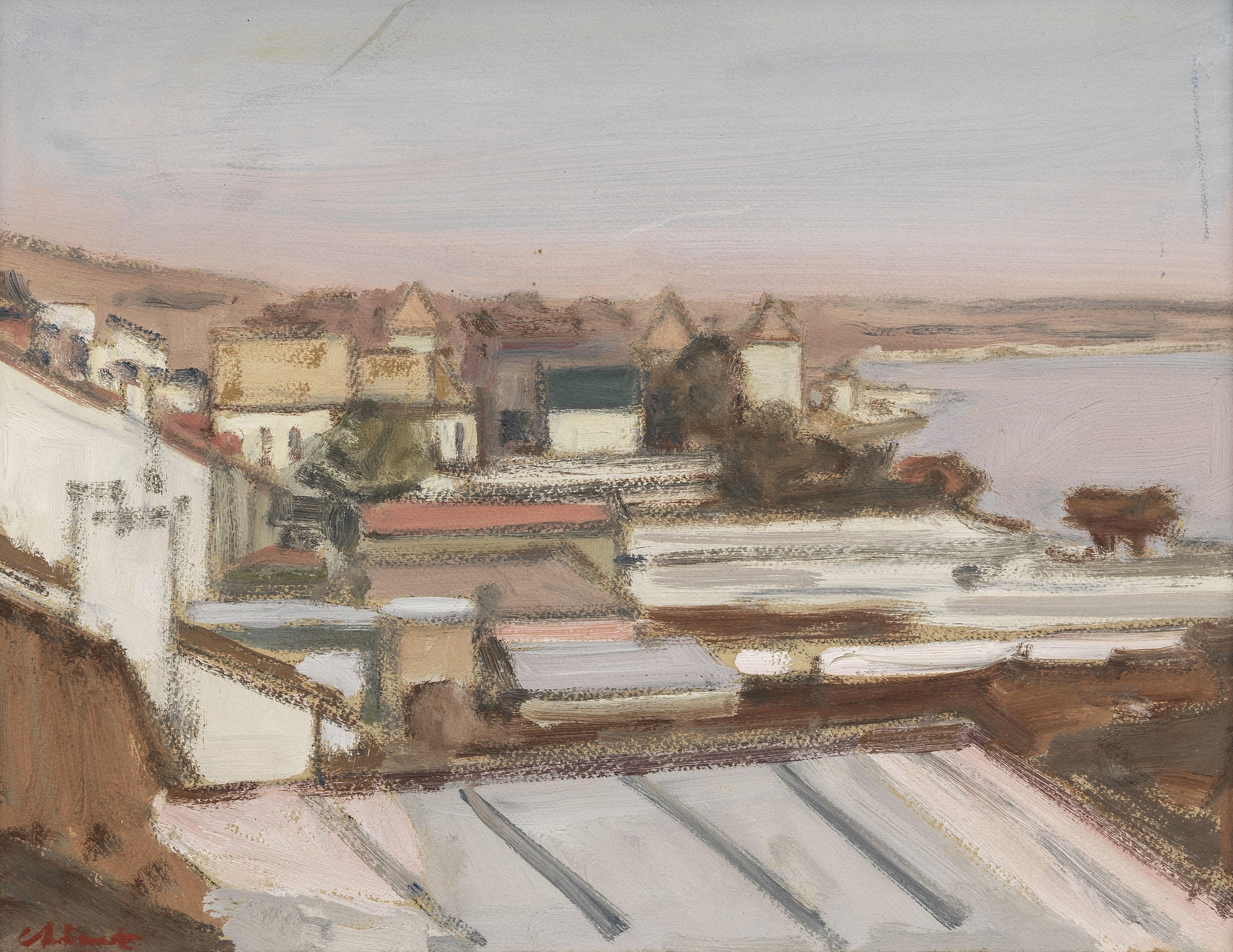 Vue de Rolle au soleil couchant, huile sur carton, signée, 28x36 cm