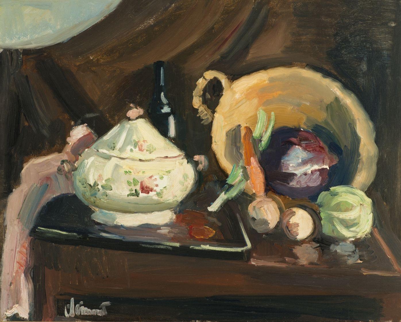 Nature morte à la soupière, à la bassine et aux légumes, huile sur toile signée, 64 x 79 cm