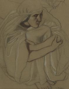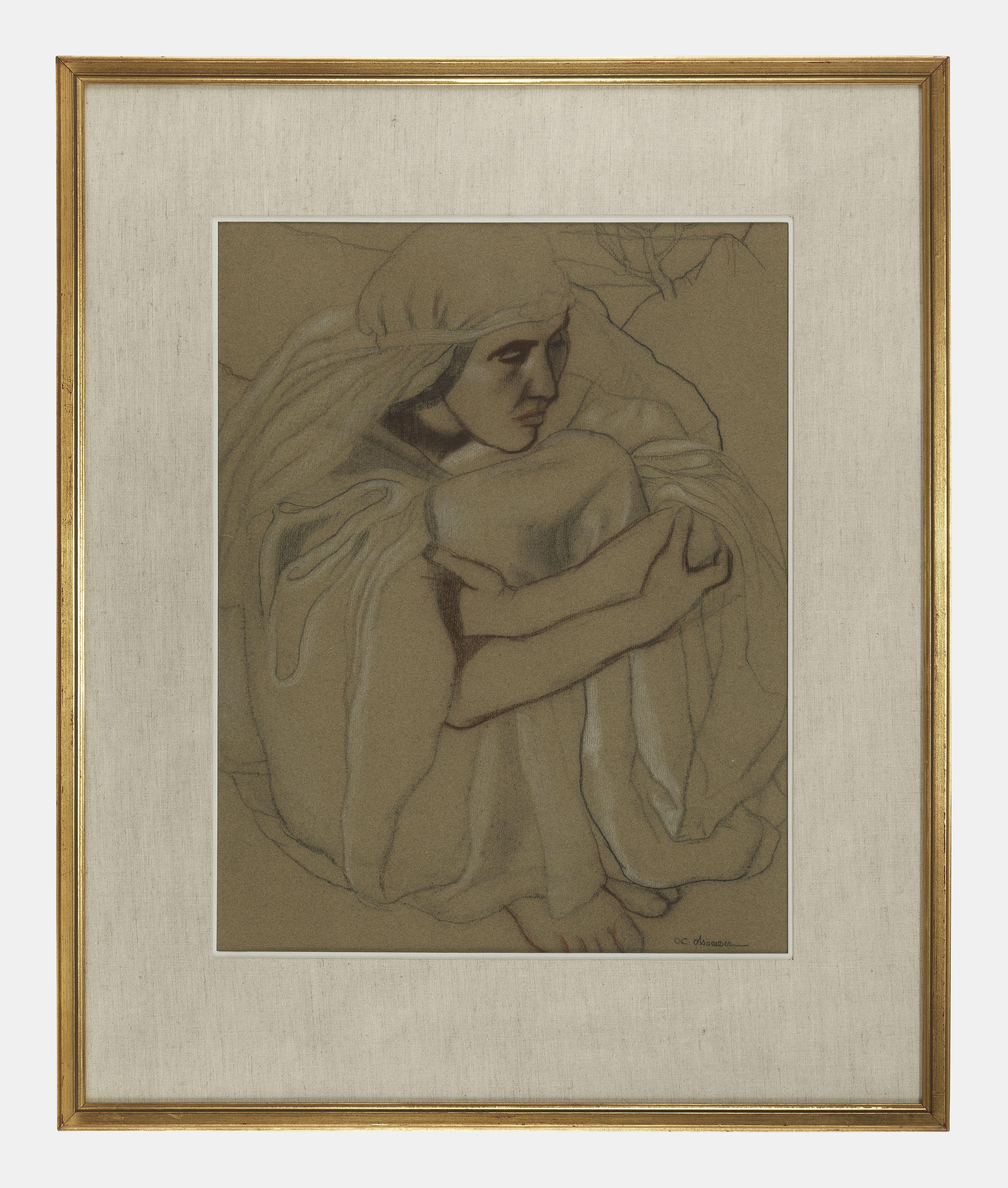Femme agenouillée, fusain et pastel sur papier, signé, 39x53,5 c...