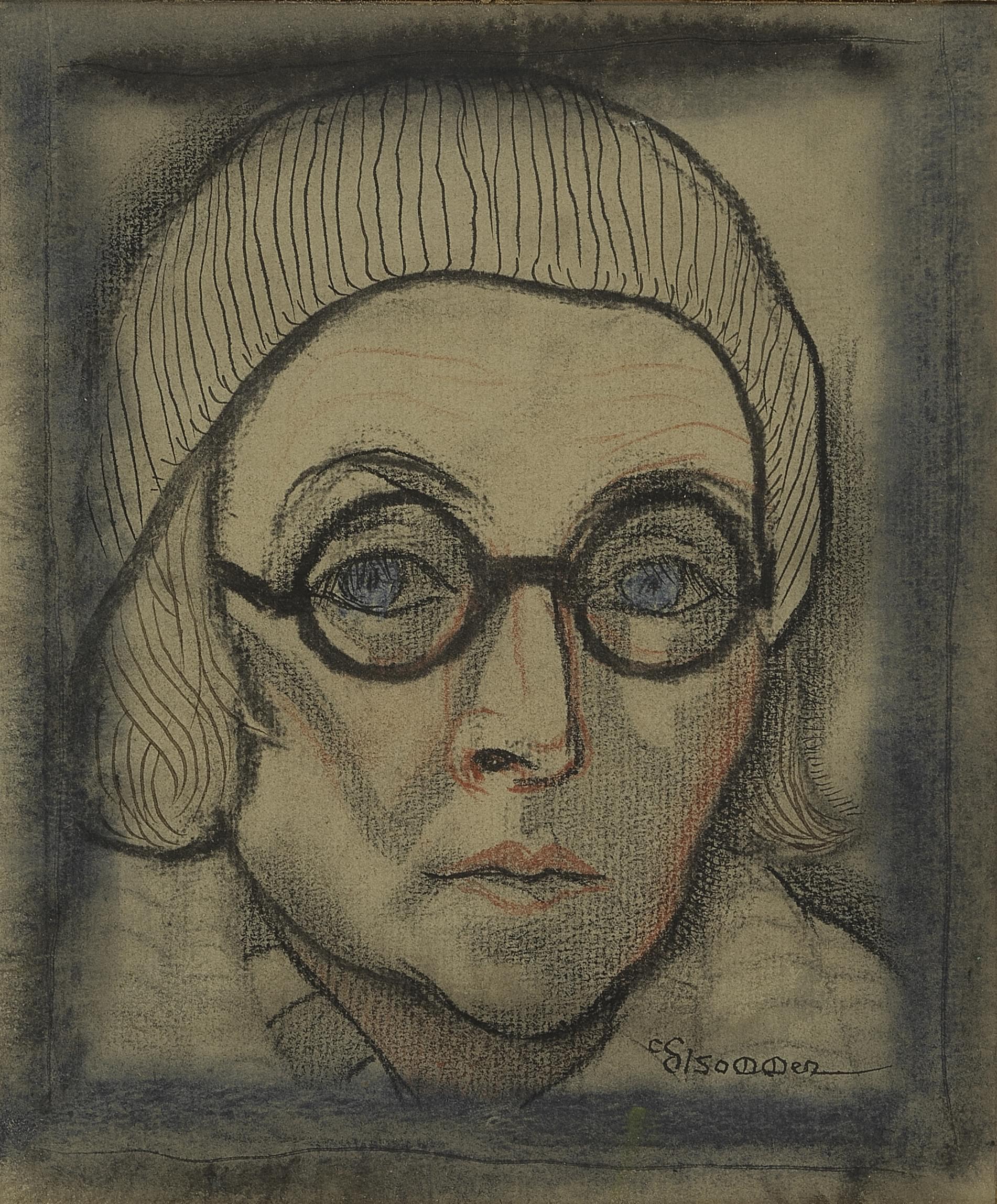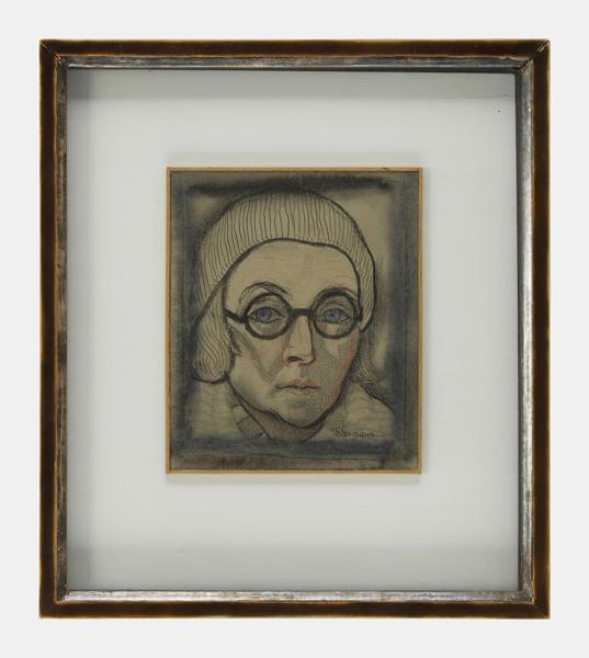 Autoportrait aux lunettes, fusain, sanguine, crayons de couleur et lavis, 18x15 cm